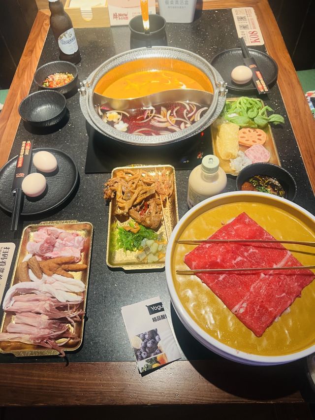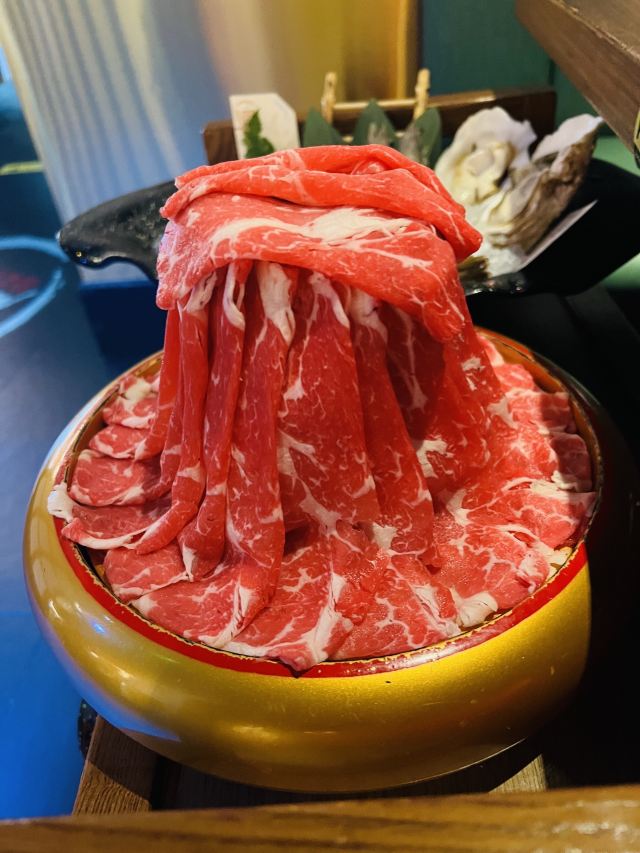 下班和同事一呼即应来吃寿喜烧 团了2人餐,400不到一点性价比还是可以的(要押金100元、以防浪费) 店内很热闹、服务员身着马面裙还蛮有特色的 点了双拼锅、寿喜烧不够甜但味道还行;海鲜拼盘的海鲜满新鲜的、店员还会帮忙处理、多了卤味选择;肉不错、雪花上脑和和牛都还行