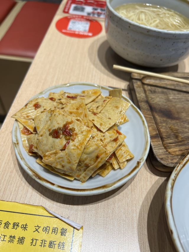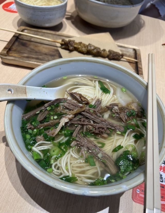 连锁拉面店,沪上分铺不多。第一次来,环境整洁,面食爱好者探店品尝。拉面可选粗细,口味可辣可不辣。喜欢清淡的汤底,很开胃。羊肉串很香,豆皮也不错,定价略高,大上海的物价。。。。。。
