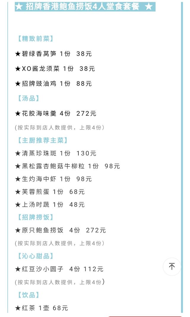 可爱的旅途88XC入的套餐,整体就和茶餐厅差不多吧,量并不多,其实个人觉得套餐的菜品质量是有差的。 特地点了份蜜汁叉烧,如图的量,看着还行,但味道真心一般。鲍鱼饭的鲍鱼个头小,不够嫩,珍珠斑不是很新鲜,鱼肉散的,从鱼骨上剥离下来不是整块。虾的质量还不错,牛肉里杏鲍菇偏多一点,两样切成差不多大小,看上去挺“热闹”。花胶海味羹,论位的话68元一位,上菜的品质也就打折后的水平。豉油鸡,味道一般。时蔬是一小份鸡毛菜。无法用性价比来评。 停车,在香港广场北座,地方不大,用餐消费可免费停2小时,到南座一楼服务台,注册会员后领取。正常收费标准是20元一小时。