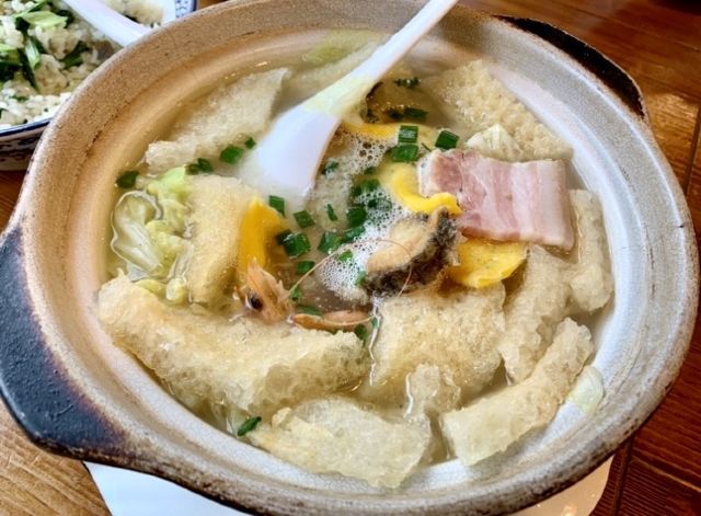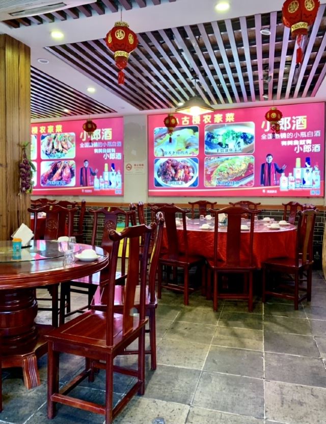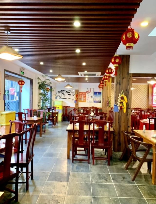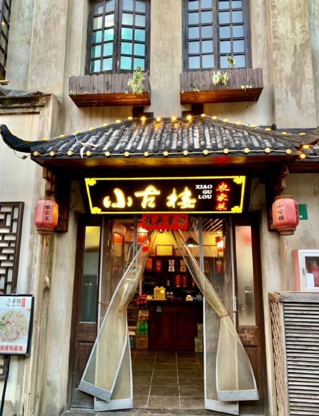 在川沙老街打卡,到了饭店就想找一家餐厅,在老街的尽头,看到这家店名和门面都有点古色古香的“小古楼”,进入餐厅,感觉大厅挺舒服的,宽敞明亮整洁,于是入座。 咸肉菜饭、三鲜肉皮汤都是上海本地特色农家菜,所以必须要来一份尝尝味道如何,端上桌后令我们大吃一惊,都是满满的一大碗啊(应该叫一大盆,哈哈),鲜而不柴肥瘦相间的咸肉、新鲜碧绿的青菜、粒粒分明软硬适中的米饭,再用猪油炒成咸肉菜饭,撒点胡椒粉,那个味道真的是鲜得眉毛都要掉下来了!农家三鲜肉皮汤里面的料多且足,有肉皮、蛋饺、虾、香菇等等,肉皮很干净新鲜,汤汁鲜美。 就这么一饭一汤,把我们两人都吃撑了!哈哈!