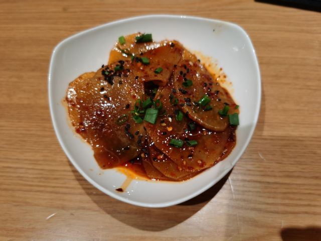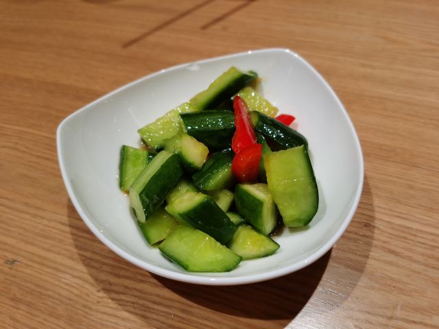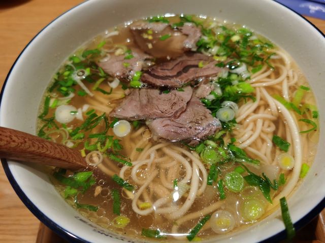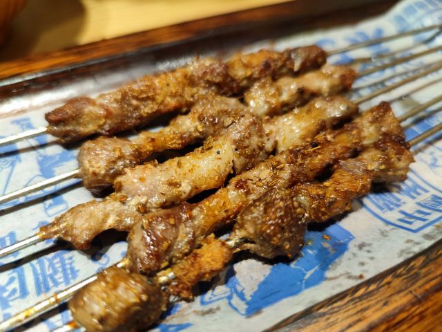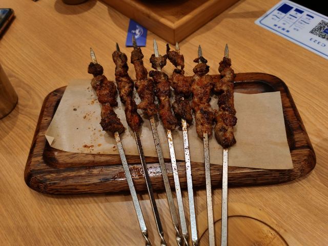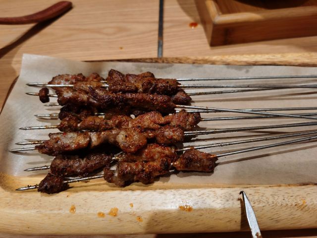 食神牛店铺开在超市入口对面,门面不大装修简洁,午市生意特别的好等了一会位。接待蛮热情不过店员不太会安排,我们一行八人想要一个大桌等了很长时间,还是自己想办法占了两个小桌再协调凑在一起。 招牌的大片牛腱子兰州牛肉面26元一碗,各自选了毛细、二细、三细的面条,面拉的不均匀特别是毛细拉的有粗有细还有结头,汤头还可以略咸,牛肉大片酥松。 钢钎大串5元一串,羊肉大粒肥瘦相间,有点焦老紧实。 钢钎小串55元一把(20串),小串的肉反而酥嫩入味一些。 手拍水果黄瓜9元黄瓜脆嫩爽口。麻辣土豆片7元很薄酥脆油辣。冰峰6元一罐西安风味汽水。 整体味道没有刚开时那么好,环境么马马虎虎,服务态度蛮好,吃饭小票可以免停车费。