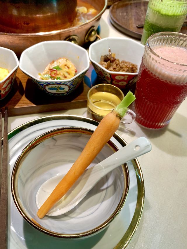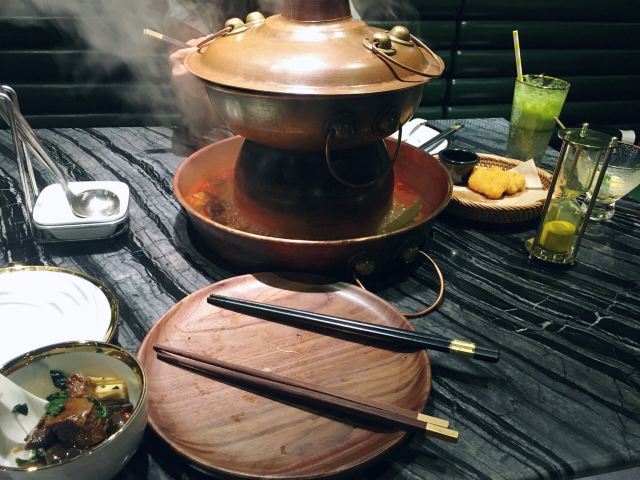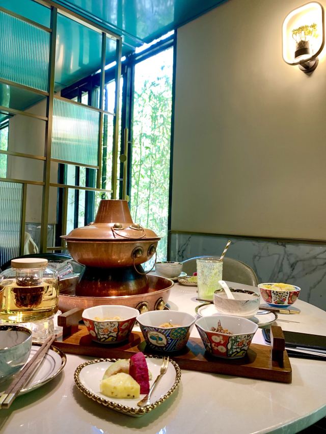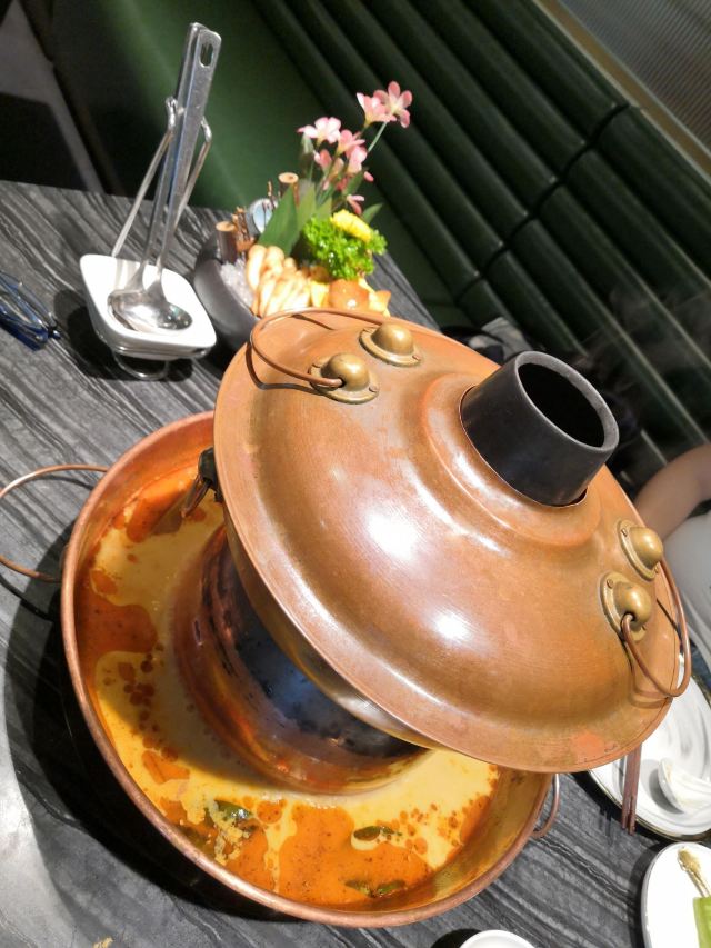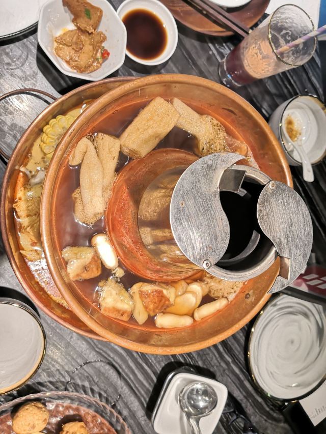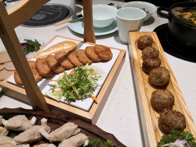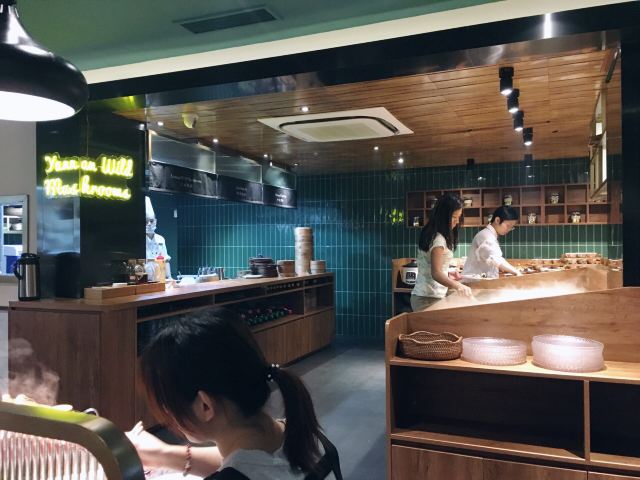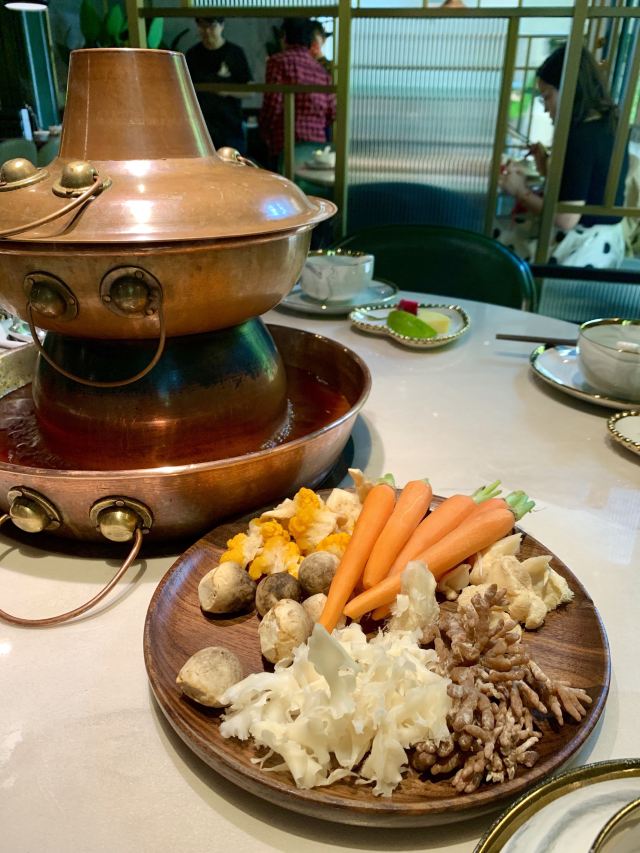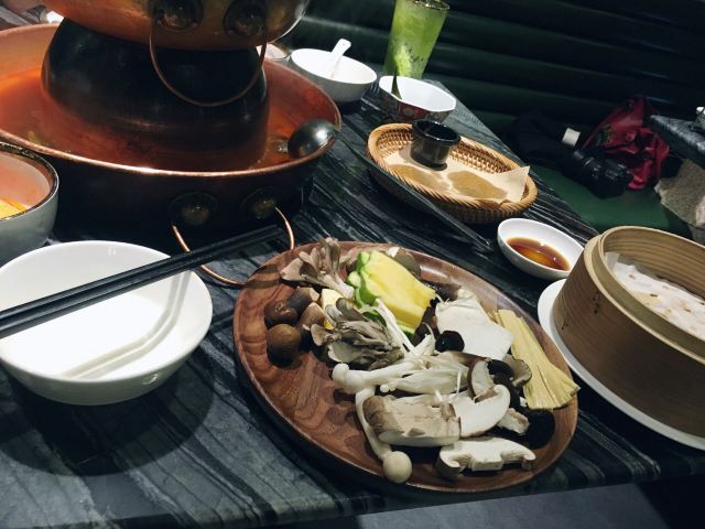 非常不错的一家素火锅店[微笑]店里环境也不错,午市人不多。自助餐台有烧好的汤品、小菜,味道都不错。这家的铜锅很有特色,新鲜的云南菌是特色,铜锅煮的菌汤特别鲜美,一定要多喝两碗后再涮锅,涮品中也是菌菇为多,很多都不认识。双层锅底的番茄汤也是特别浓郁好喝[强]珍贵的菇类是按克给每人上的,限量不添加。除了火锅还有很多主食点心做得都不错[强]炒饭非常好吃,就是容易吃撑。汤包完全吃不出素包的感觉,非常满足[调皮]这里调制的各种饮料也是不错的,试了两种都好喝。