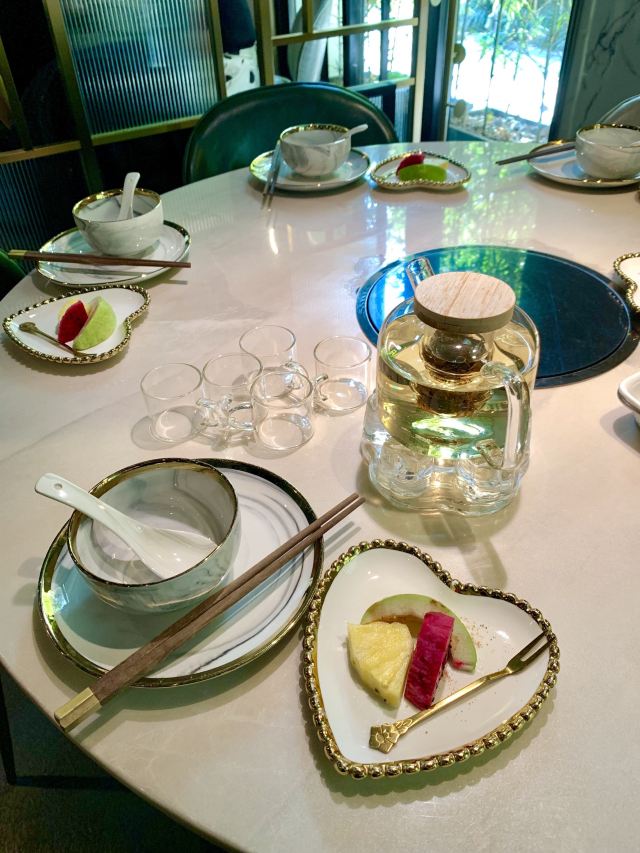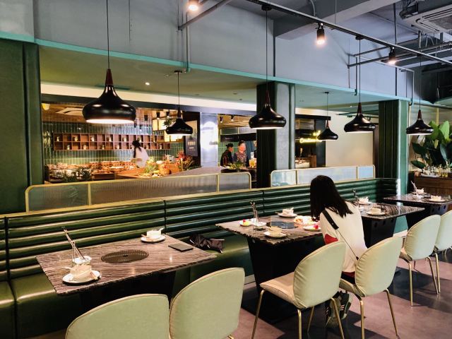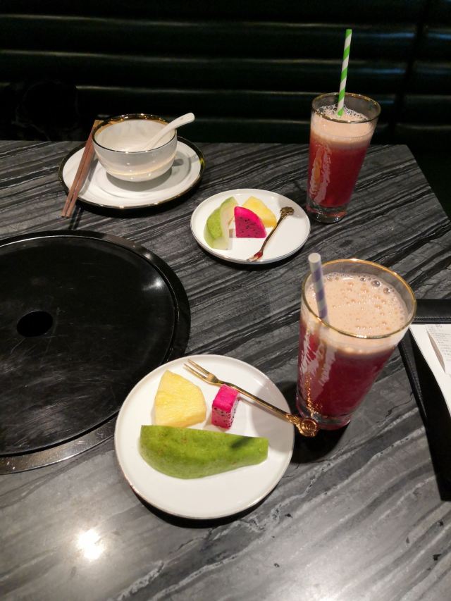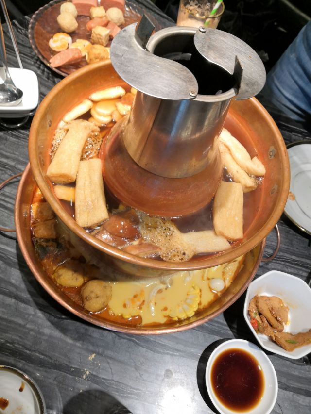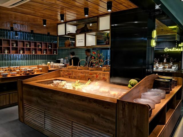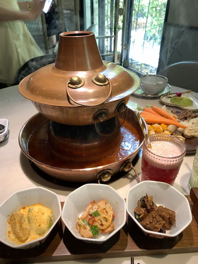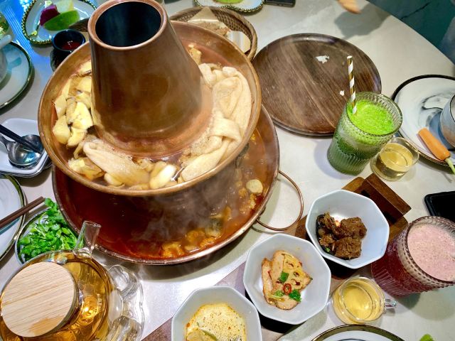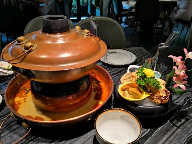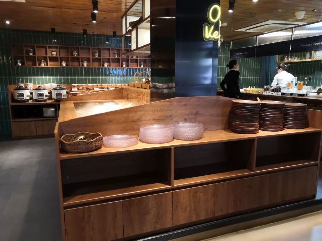非常不错的一家素火锅店[微笑]店里环境也不错,午市人不多。自助餐台有烧好的汤品、小菜,味道都不错。这家的铜锅很有特色,新鲜的云南菌是特色,铜锅煮的菌汤特别鲜美,一定要多喝两碗后再涮锅,涮品中也是菌菇为多,很多都不认识。双层锅底的番茄汤也是特别浓郁好喝[强]珍贵的菇类是按克给每人上的,限量不添加。除了火锅还有很多主食点心做得都不错[强]炒饭非常好吃,就是容易吃撑。汤包完全吃不出素包的感觉,非常满足[调皮]这里调制的各种饮料也是不错的,试了两种都好喝。