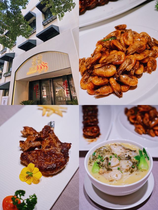 加油干饭呀提起鹭鹭只想给她这样一个形容,本帮菜馆里的教科书,鹭鹭1985大张旗鼓重新装修,独栋老洋房旧貌换新颜,不管外观还是装修都令人眼前一亮。 底层是大堂座位错落有致,每桌之间都有隔断,确保了安静私密的用餐氛围。二楼设有雅致包厢,适合朋友聚会和宴请宾客。 🥩秘制孜然羊排🥩西式精美摆盘搭配中式孜然调味,论颜值似乎要与西餐厅一争高下,黯然销魂的肉香直击味蕾,羊排鲜嫩多汁没有膻味,入口肥而不腻唇齿留香。 🦐经典油爆虾🦐无疑是本帮菜的代表,虾壳炸制油亮酥脆,虾肉鲜嫩风味犹存,是不容错过的开胃菜。 🧆鹅肝酱焗藕饼🧆又是一道中西合璧的创意佳肴,浓油赤酱的本帮做法非常迎合上海人的胃,酥脆藕饼包裹鲜香鹅肝酱,色泽浓郁香气扑鼻,入口糯而不腻,绝了! 🍜金牌黄鱼汤面🍜去刺的黄鱼肉又鲜又嫩,面汤选用高汤熬煮而成,细面爽滑Q弹富有韧性,最后就连鱼汤都没舍得浪费。