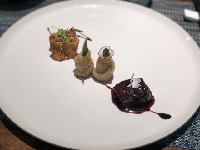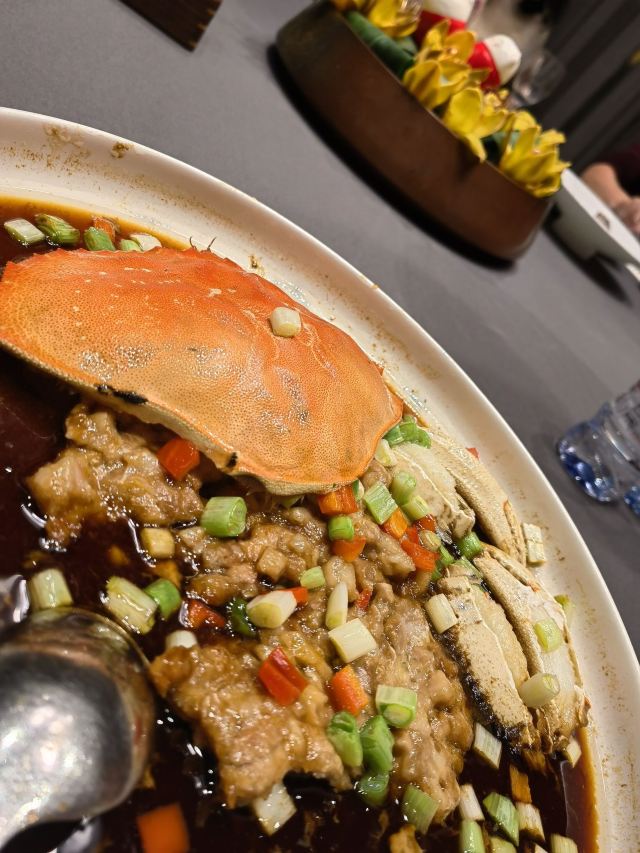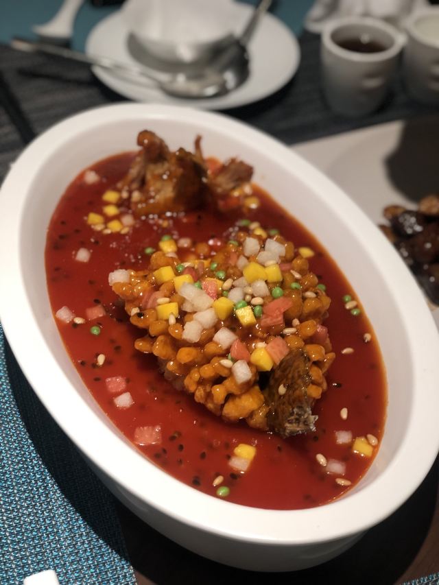 蛋花食游记爱琴海附近独栋小洋房的私房菜,环境优雅,档次体面高大上,但价位相对于整体菜品环境却是很适中。请客体面过人,平日晚上已经大厅已经翻了2次台了,还好提前预约,否则还不一定吃得上。 本帮菜上来的都是硬菜,味道和量都可圈可点。摆盘也非常地精致,素烧鹅,桂花糖醋腩小排,黄鱼卷,精致的位上冷菜,非常地特别,每一道一小口却能尝足3中口味,食材优良,糖醋腩小排肥瘦相间的肉质,入口口感非常地棒,黄鱼卷,有醋料理分子点缀上面,鲜香厚滑,令人回味。 松茸汤是必点汤品,清雅浓香,满口芬芳,这个时节喝也很适合。 松鼠桂鱼,百香果味道浓郁,这是我吃过的最好吃勾芡最完整最浓郁的松鼠桂鱼了,肉软嫩鲜香,带着果香,非常地棒,物有所值。 基本点的菜都没有踩雷,很和心意,在我的宴请list上加上这一家不会出错.