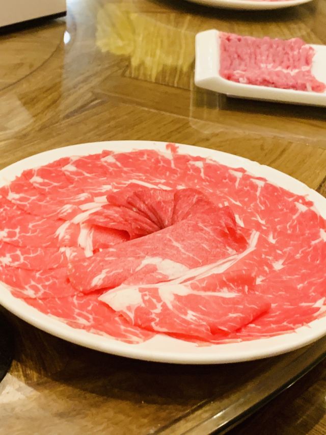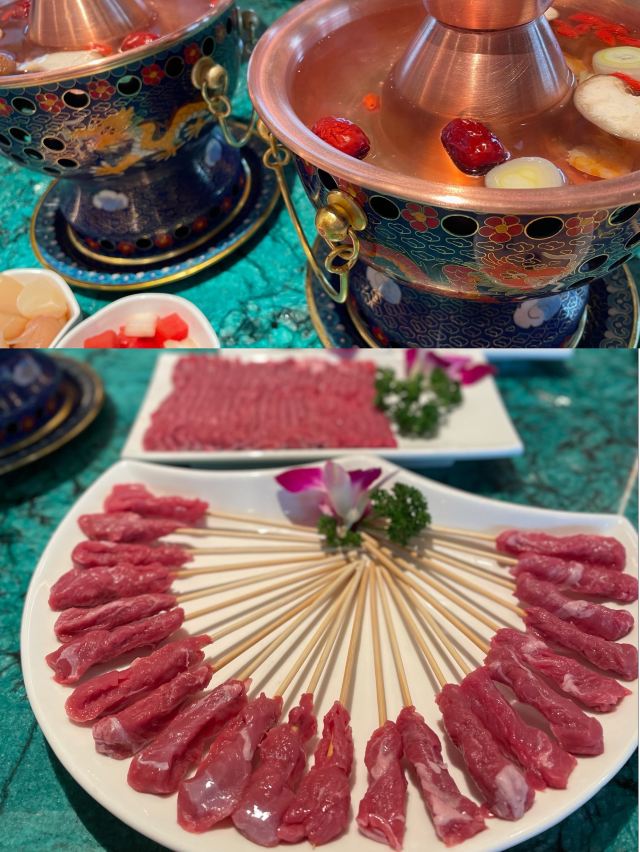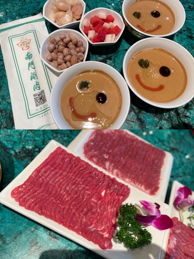 热气羊上脑,麻酱蘸料,现切羊腱,牛舌,鲜羊肉,麻酱小料,鲜羊上脑,糖醋蒜头,烤烧饼,一人一锅,元宝肉,鲜牛百叶,虾滑,羊肉瓜肉串,肉肉肉