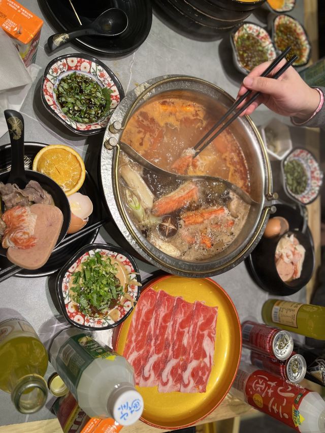 和朋友相聚第一次去吃,等了比较久,人气还是挺旺的,总体来说性价比还是不错的。冰柜里的饮品种类尚可,有很多小朋友爱喝的:啵乐乐,旺仔牛奶,还有雪菲力[调皮],肉类的话一般般吧,吃饱喝足就行,除了畅吃的肉,蔬菜丸子也尚可