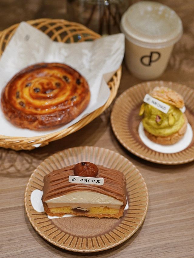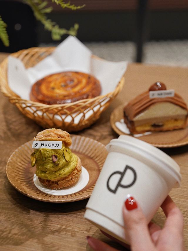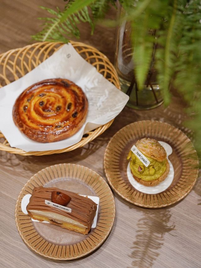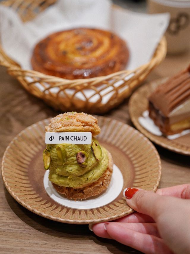 加油干饭呀有多少人是因为开心果泡芙而认识了PAIN CHAUD ❓说它是开心果代言人,应该没人反对吧❓这一抹翩跹而至的开心果色,不管何时何地都恰如其分🍃 如今它又来到炙手可热的瑞虹天地太阳宫,剧场设计风格令人眼前一亮,作为一家有温度的法式烘焙店,真的颜好实力佳👍工作日值得为它翘班,周末愿意为它钻出被窝,让你不由自主掉进PAIN CHAUD的碳水陷阱。 💚开心果泡芙💚 颜值在线出品稳定,让甜品控的思念归0,光是小清新色系就已经足够讨喜,顺滑卡仕达酱融合开心果粒,松脆酥皮搭配香浓黄油挞底,一勺下去层次丰富,吃上一口嘴角上扬 🤎栗子挞🤎 或许,唯一能媲美开心果在我心目中地位的,就只有栗子了吧🌰浓郁甜润的栗子挞,一层栗蓉一层奶油一层蛋糕,刚取出时还伴有冰冰凉凉的口感,让你一整个爱住了🙆🏻♀️ 最后惊喜地发现,就连打包盒都是开心果色,完全长在我的审美之上啊🌝