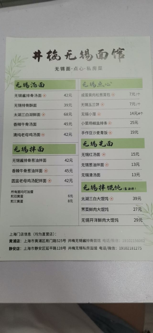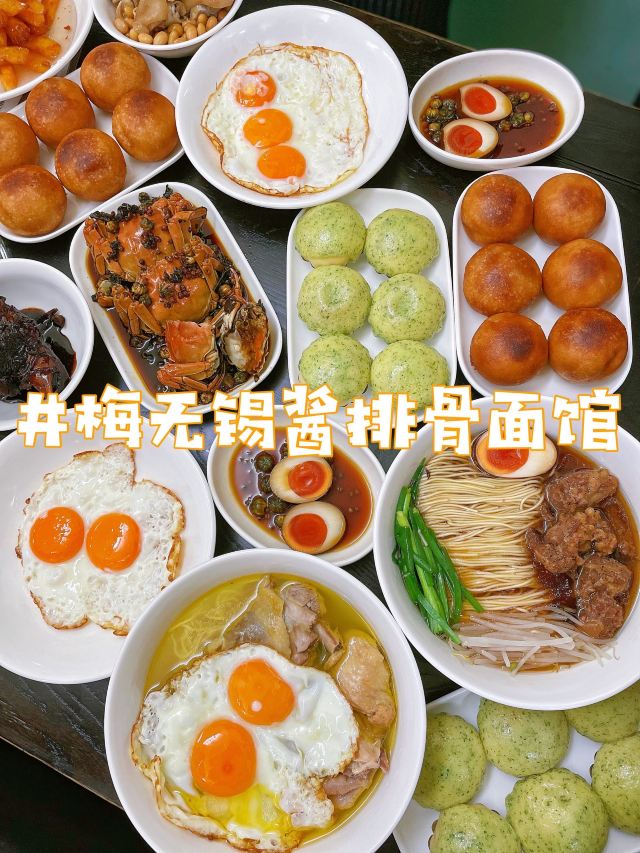 吃饭就别叫我了杭州南京网红店层出不穷,无锡却鲜有耳闻,魔都虽有铺天盖地的蟹黄面和本帮面,相对小众的无锡面却是一枝独秀🔝 💮井梅无锡酱排骨面馆💮开到了局门路,面食爱好者必须来捧捧场💃这家宝藏面馆真的太🉑️了!吃完以后面不改色算我输! 1天卖出500碗的🍜无锡酱排骨面🍜,从弄堂火起来的井梅酥面,传说中1头猪只够做出1碗面,汤和面还能无限续加∞每一块酱排骨都酥到了骨子里,筷子一夹就断,配以手工面真是大写的满足。 无锡小点心也从来没让人失望过,地地道道的🧡无锡玉兰饼🧡,井梅应该算是魔都首家,替你们试过了,口味简直神还原‼️ 金黄酥脆的焦香外皮,包裹软fufu糯叽叽的糯米团子,饱满鲜甜的酱肉一口biu汁,既然省下高铁票,还不赶紧多吃几颗~ 神仙CP的💛咸蛋黄肉松葱茸包💛,瞬间触发真香警告⚠️流心馅料一口爆浆,咸蛋黄肉松混合猪油香气,绝了啊💯 XXXL号的💚苏式薄荷绿豆汤💚,超大杯太给力,里面除了扑满扑满的绿豆,还有糯米、红绿丝、蜜枣、冬瓜糖、葡萄干……秋天的第一杯绿豆汤,拿捏了✔️