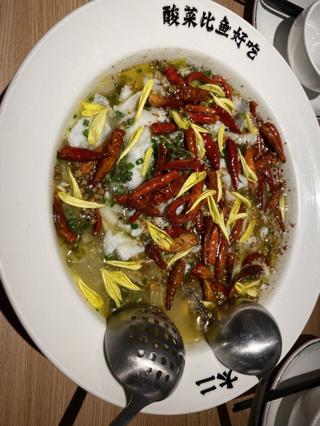位于漕河泾印象城三楼东侧。 排队不少,不过店堂只有二人座及3-4人座,翻台比较快,也不会太长时间,半小时左右吧。 鱼是特色,用的是鲈鱼,肉质鲜嫩紧实,基本无刺。酸菜汤酸辣入味,包裹鱼肉的鲜,非常不错。偏辣,且仅一个口味没有选择。承受不了辣的可以要一碗高汤,涮一涮再吃。 这家店不能提供果汁饮料等,备了免费陈皮茶,味道不错。