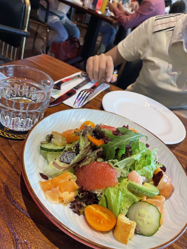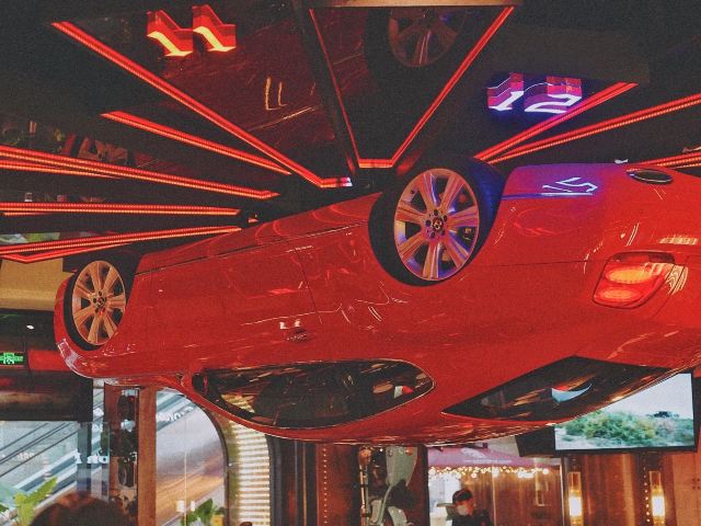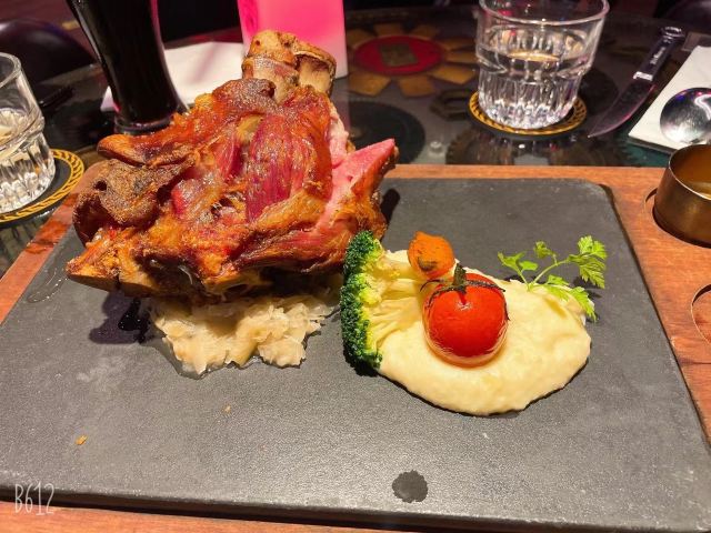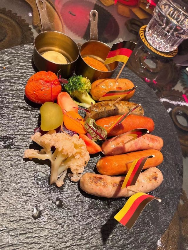 alex1700先团购了一张80抵200的代金券再去消费,算下来人均160的德国菜,性价比还是不错的。 天花板上火红的跑车,非常亮眼,加上车底四射的红光,被朋友形容是奇特又美丽的蜘蛛,还真挺形象的! 火焰烤猪肘,除了仪式感,菜品本身皮酥肉嫩,好吃,搭配底下的酸菜可以解腻。因为酸菜太少,一开始店家还要加收钱,幸好后来顺利解决。 三文鱼塔塔既好看又开胃,炒蔬菜也不错,清爽不油。香肠拼盘虽然有六种口味,但有的太小,每个人一小口,尝不出什么特点,不喜欢。 甜品“当心磕牙”有造型奇特的巧克力和多种水果,最受欢迎。他们家的黑啤香醇,还有插著两支玻璃试管的哈莉奎茵好看又好喝,是一次难得的体验。