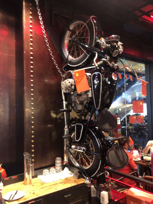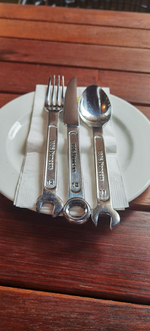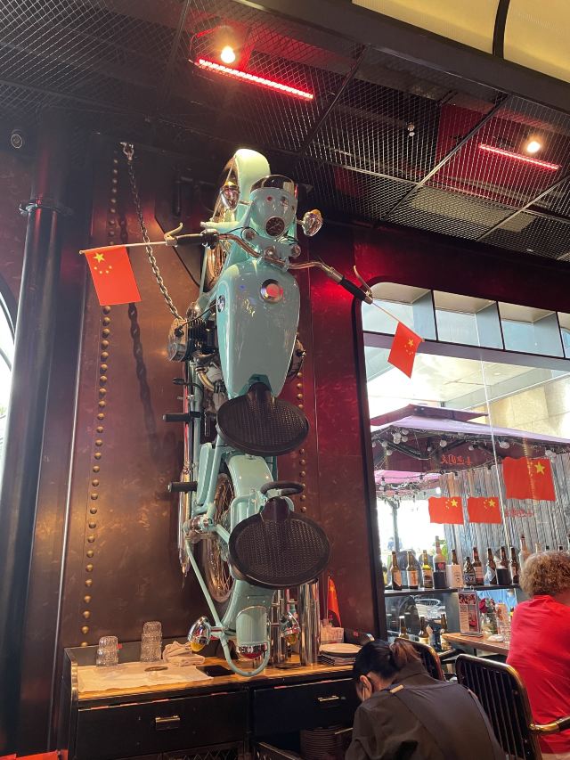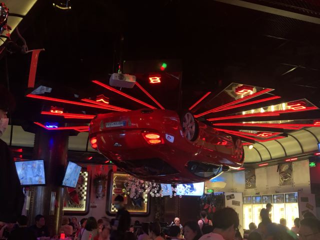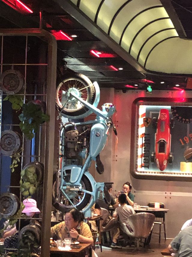 这家店主打的是德国的餐饮,也就是说是啤酒和烤肉的餐吧,生意非常的不错,位置也很好,就在正大乐城广场的旁边,而除了室内座位外在室外还有差不多十桌的样子,由于中午人很多,我们一点都到的,还需要等位,所以选择室外的座位还是挺凉快的,这家酒店主打的是汽车风格,在室内有一个倒挂的汽车,这个和其他店的风格是一样的,而且这里的餐具很有意思,他的刀叉另外一头都是工具,所以有一种工厂的风格,这家店的主打的是德国的饮食,它的火猪肘手上来的时候,整个猪肘是可以有火焰的,这个现场的画面感很强,这里的香肠分量很少,所以如果可能的话,你可能需要点两个。迷你汉堡味道很好,面包稍微有点脆,肉也非常的满足,这里的啤酒味道也很好,由于是中午,所以只喝了300毫升。