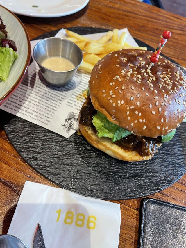 湘阴王离这家店主打的是德国的餐饮,也就是说是啤酒和烤肉的餐吧,生意非常的不错,位置也很好,就在正大乐城广场的旁边,而除了室内座位外在室外还有差不多十桌的样子,由于中午人很多,我们一点都到的,还需要等位,所以选择室外的座位还是挺凉快的,这家酒店主打的是汽车风格,在室内有一个倒挂的汽车,这个和其他店的风格是一样的,而且这里的餐具很有意思,他的刀叉另外一头都是工具,所以有一种工厂的风格,这家店的主打的是德国的饮食,它的火猪肘手上来的时候,整个猪肘是可以有火焰的,这个现场的画面感很强,这里的香肠分量很少,所以如果可能的话,你可能需要点两个。迷你汉堡味道很好,面包稍微有点脆,肉也非常的满足,这里的啤酒味道也很好,由于是中午,所以只喝了300毫升。