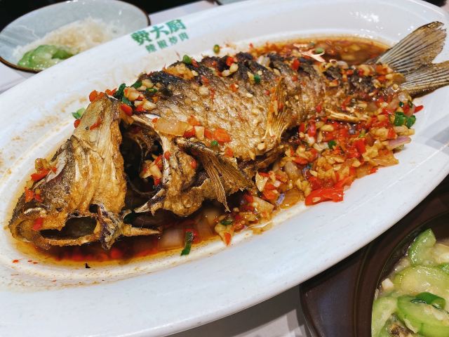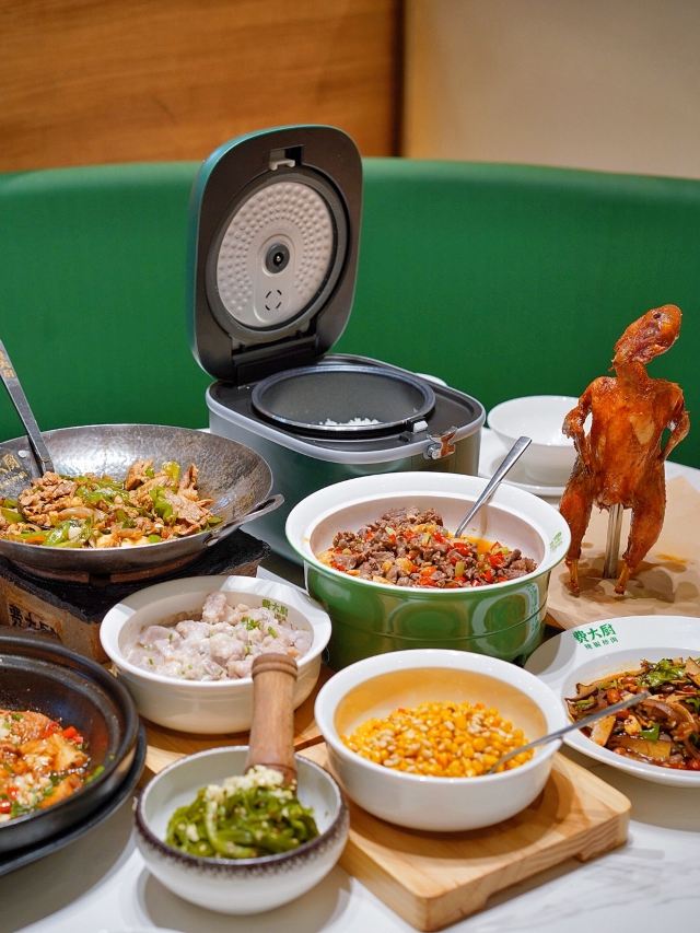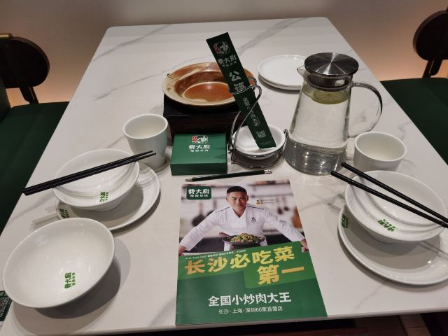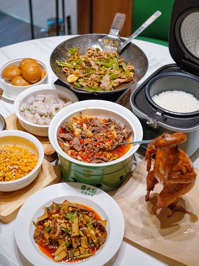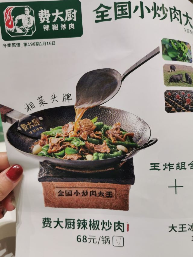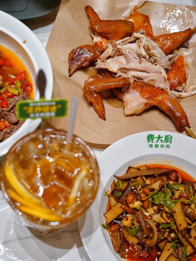 费大厨辣椒炒肉,大王冰柠檬茶,皮蛋青椒擂茄子,香芋蒸排骨,香酥大鲫鱼,砂锅嫩豆腐,酸辣跳跳蛙,大厨手撕鸡,香辣鱿鱼须,湘辣热卤,小炒黄牛肉,小锅东北鲜米饭