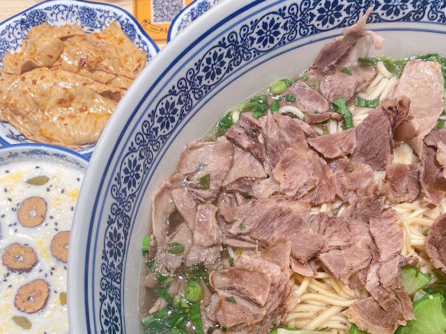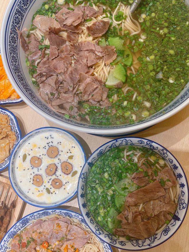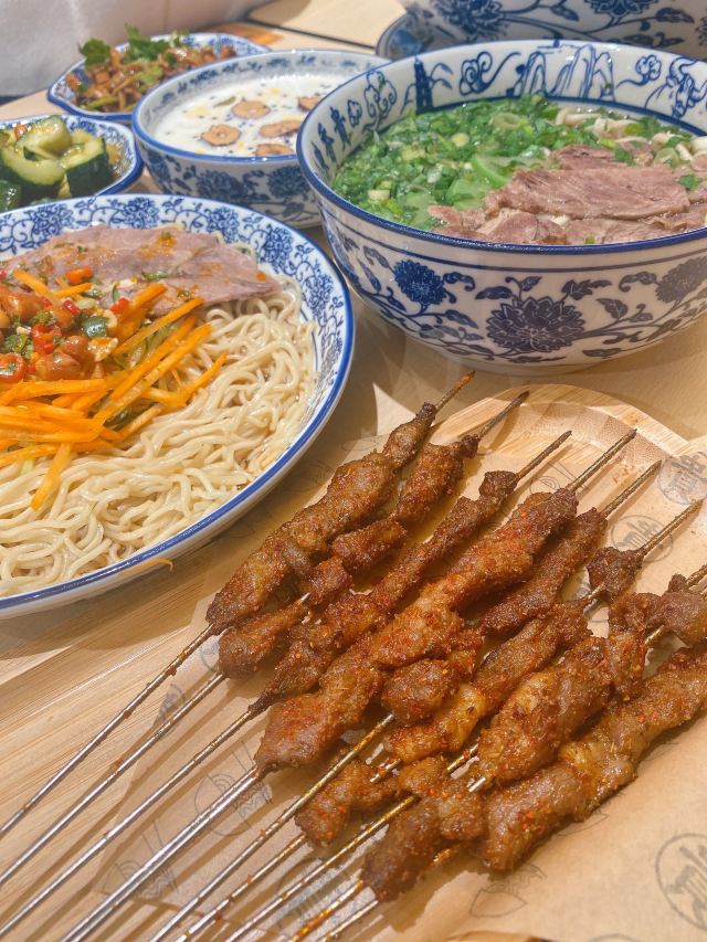 牛骨清汤兰州牛肉面,钢钎羊肉串,陈香贵兰州拉面,牛肉拌面,凉拌木耳,茶叶蛋,红油笋片,虎皮凤爪,海带丝,卤牛肉