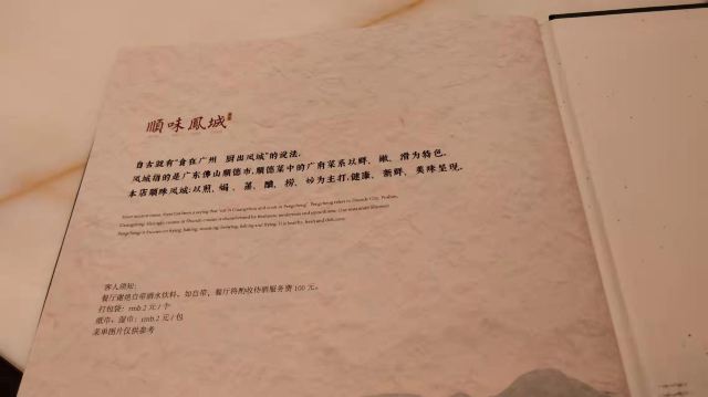 顺德走地鸡捞起,招牌无骨大鳊鱼,生啫雪花牛舌,顺德拆烩鱼茸羹,顺德煎酿双宝,凤城香煎鲮鱼饼,熟腌花蛤,豆酱炒水东芥兰,传统双皮奶,南乳肉
