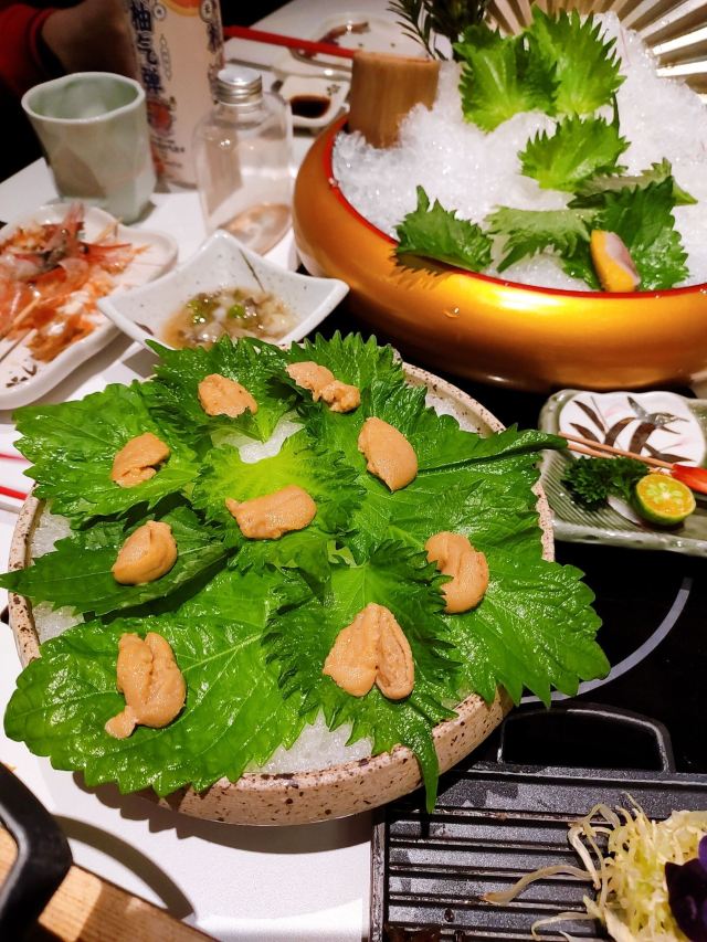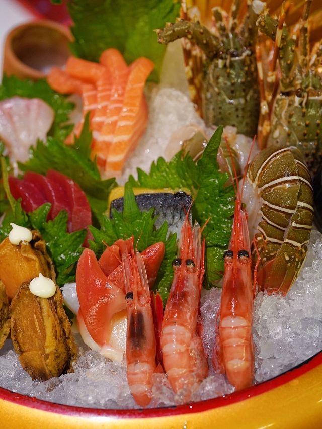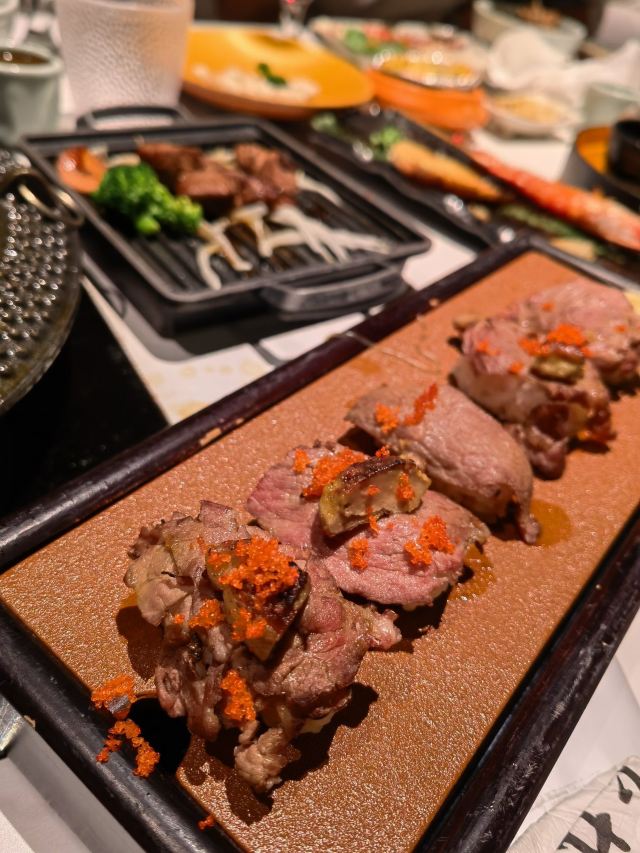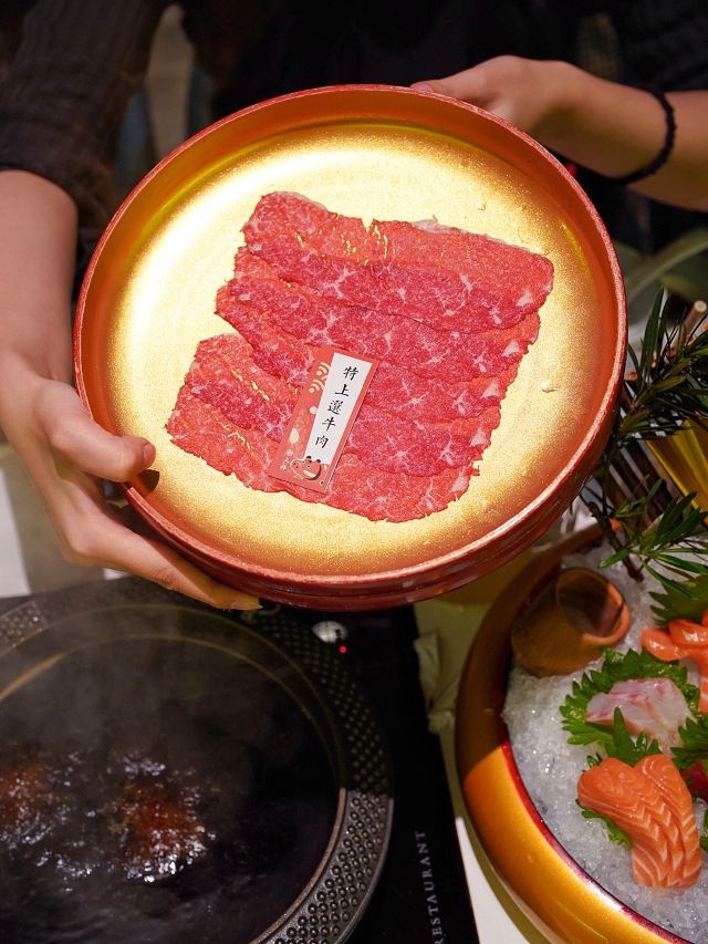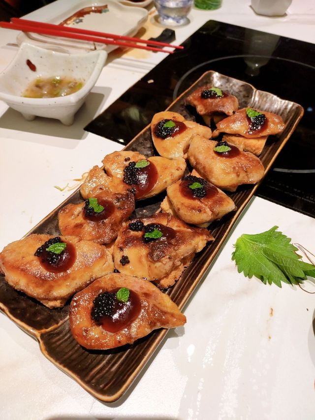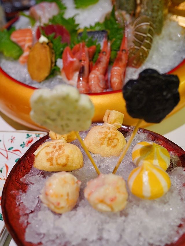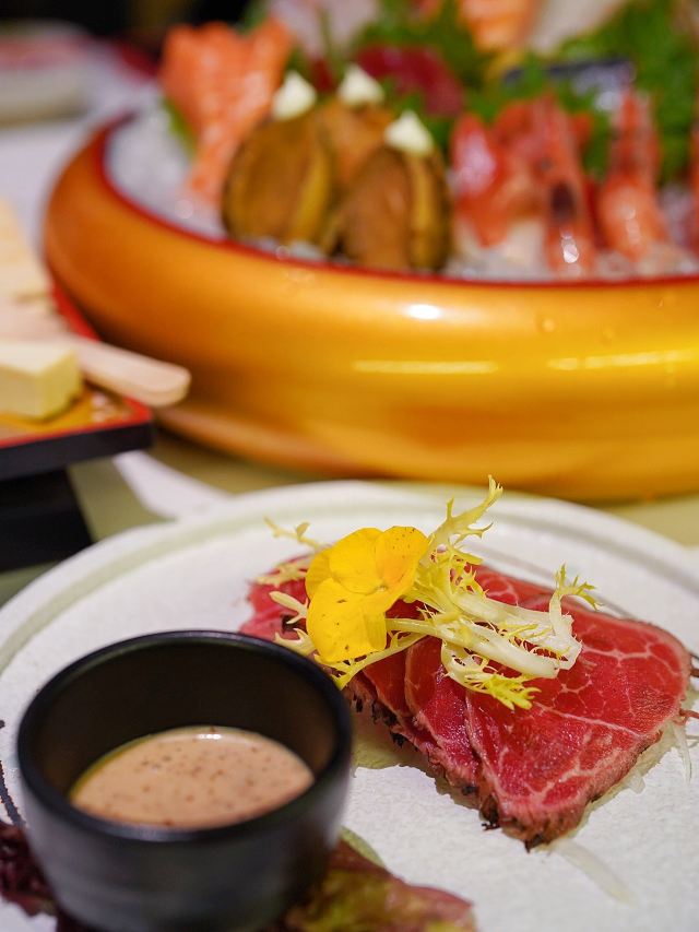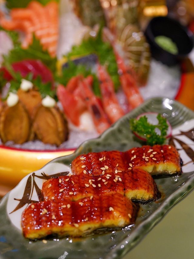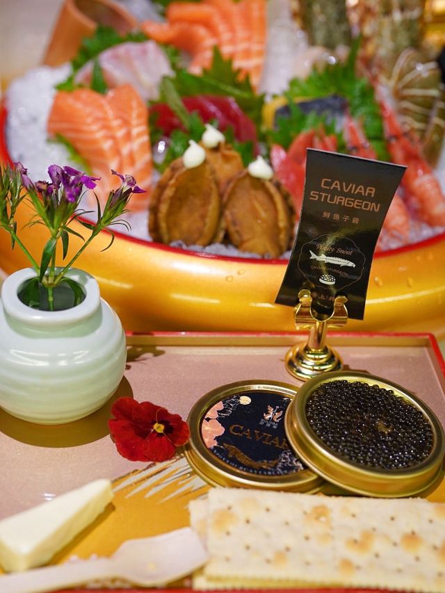 刺身拼盘,三文鱼,法式红酒肥肝,寿喜锅,厚切牛舌,鲜虾鱼籽鳗鱼海胆手卷,鲟鱼黑鱼子鹅肝(限定),蒲烧鳗鱼,大红袍奶茶,奶酪蟹煲