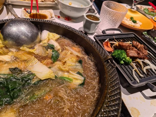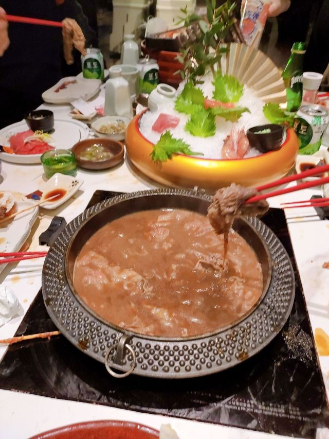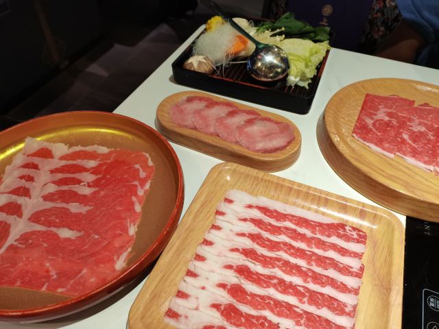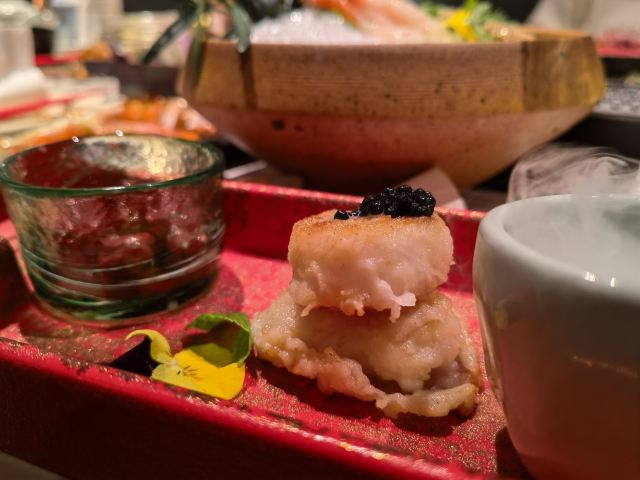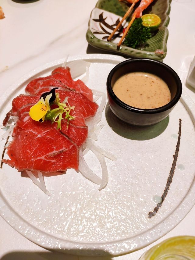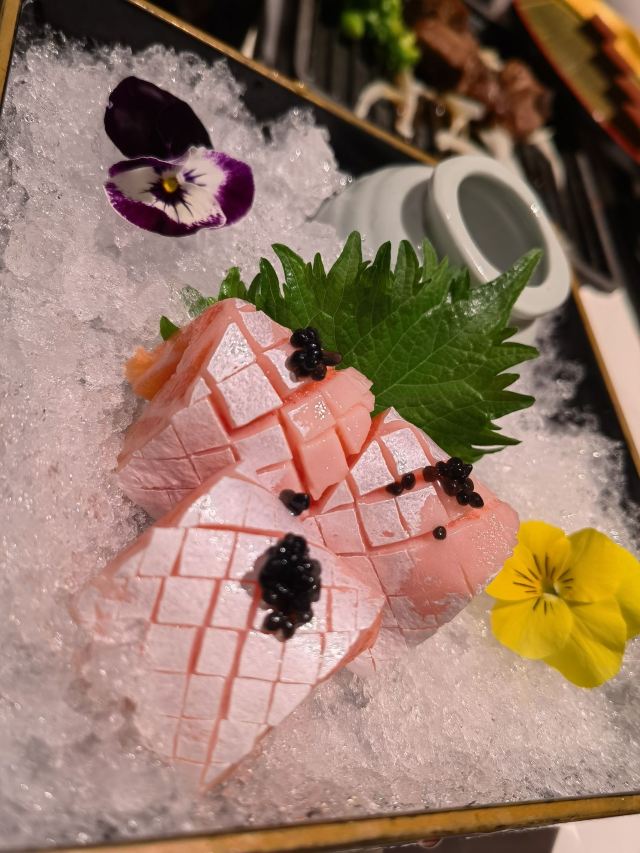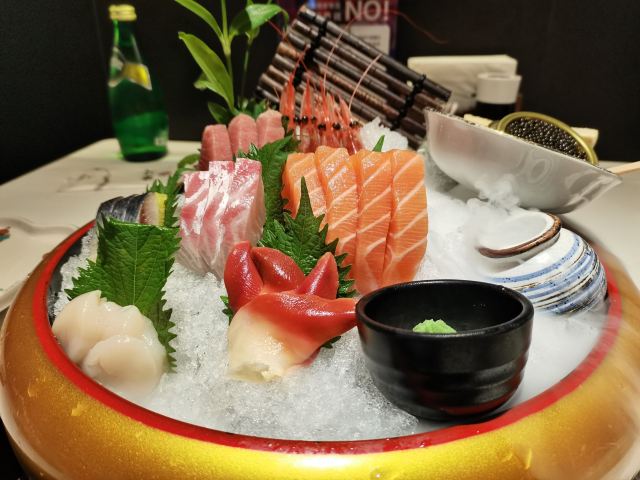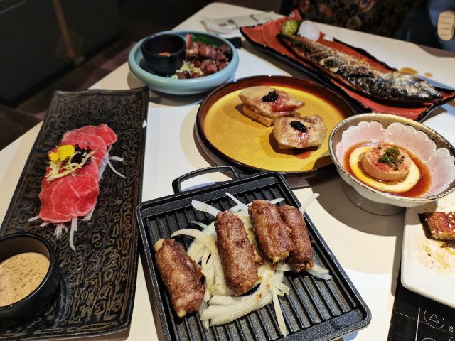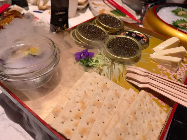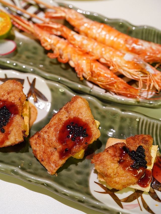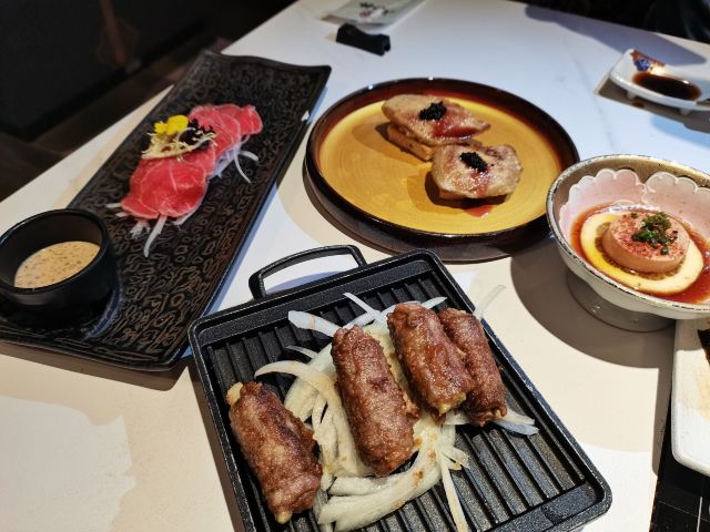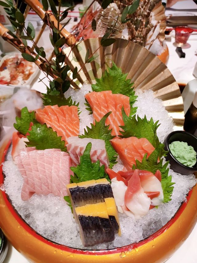 刺身拼盘,三文鱼,法式红酒肥肝,寿喜锅,厚切牛舌,鲜虾鱼籽鳗鱼海胆手卷,鲟鱼黑鱼子鹅肝(限定),蒲烧鳗鱼,大红袍奶茶,奶酪蟹煲