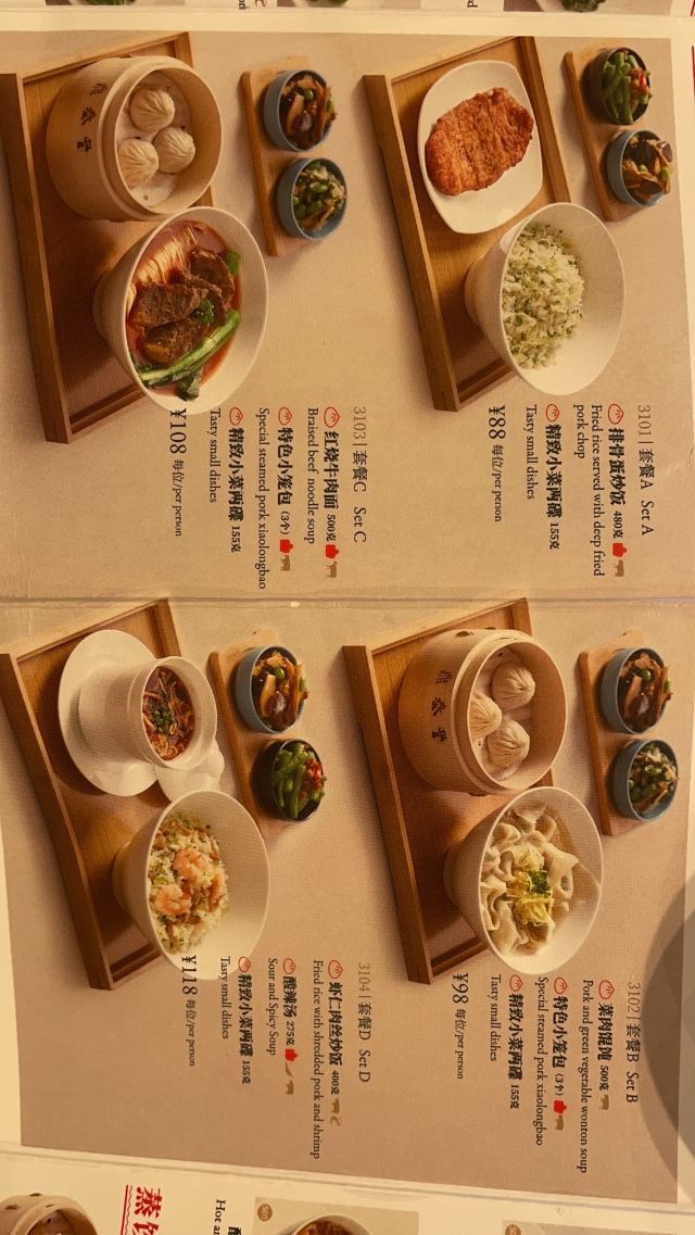 特色小笼包,蟹粉小笼包,红烧牛腩面,红油虾肉抄手,干煸四季豆,虾仁炒饭,葱花蛋炒饭,红烧牛肉面,荔芋西米露,虾肉蒸饺(3颗)