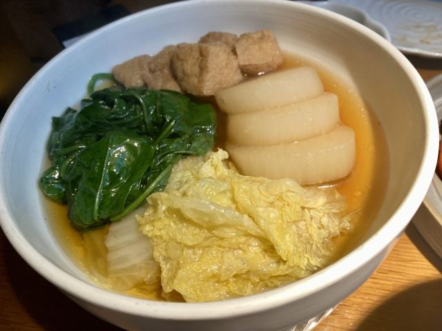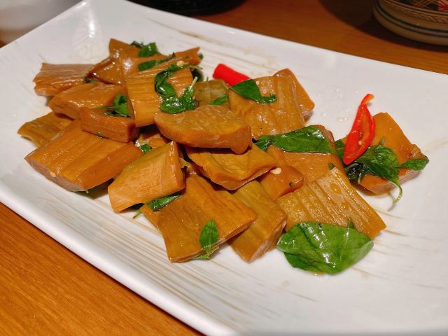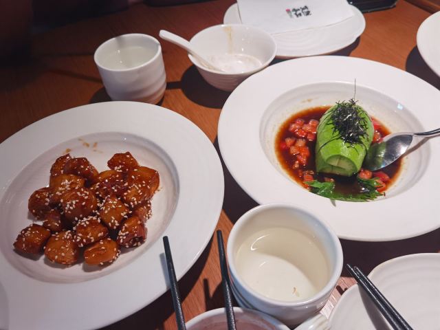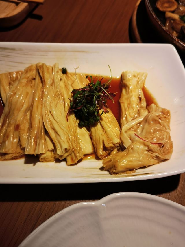 囊括各种菜系的素食!因为这家店,第一次来到了前滩太古里。 【环境】 在前滩太古里找店家不是特别容易,指引上只显示了大类,没有明细的店家。找到后,门面异常日本风。 【服务】 服务挺好,上菜速度挺快的。有一位负责倒水的阿姨,一直在主动添水。 【口味】 「桂花荔浦芋儿」价格很实惠的一道小凉菜,甜甜的,伴有桂花香。 「自然农法小米粥」端上来一个小罐子,小米粥并没有盛满,以为只是一点点,不料吃着吃着,还挺多。 「泰椒香菜捞汁」这道很特别,很少有这样的组合凉拌菜。里面的腰果非常软。 「铁板焗笋排」笋的量挺多的,而且笋很嫩。 「粉蒸猴头菇」猴头菇的这个做法不多见,很有肉的口感。 「干挑馄饨」馄饨里面的馅料是荠菜笋丁,偏油腻了些。 「云南野菌汤面」这碗面真是绝了,特别好吃,面条很好吃,汤也很鲜,里面的浇头其实不多,就是西葫芦,香菇等,是煎过的,很有味。 「柠檬坚果蛋糕」这道甜品也不错,最底下的坚果很夯实,一块的量太多了,可以分享。