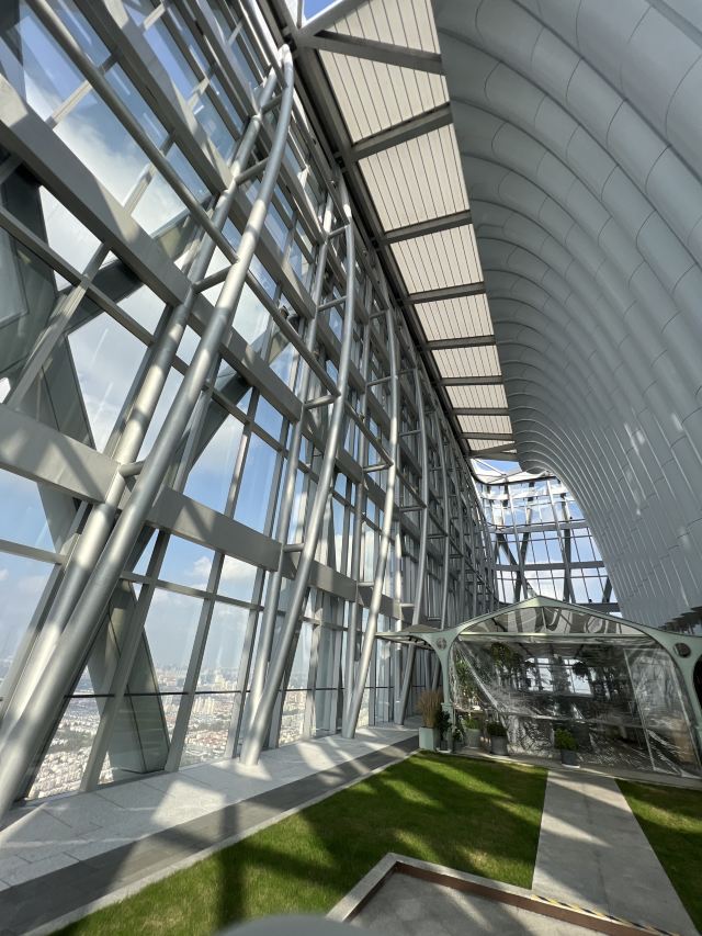 High·Yun jian By Light&Salt (Former Bund Center Branch)前滩太古里开了近一年,前滩中心也差不多吧,蛮早就种草了这家,正好来拔拔草。 定位很客气,加了我微信后发来了详细的定位确认函,还仔细用图文一起描述了不同方式如何抵达,尽管如此依然还是出现问题:开车用确认函中的定位是准确的,但是用同名的“前滩太古里石区停车场’到导航软件中搜索会开到相距 200米左右的另一个石区停车场,而且两个石区是不通的。记佳一定是选择前滩中心对面的石区停车场入口才是正确的。 地下车库也是蛮大的,找入口也要花费点时问。 到42层换乘区域的光与盐的饮品站,会有服务人员引领到顶楼的这个餐厅。 环境: 是属于光与盐的高端餐厅,整个一层楼就这么一间餐厅,层高非常高,而且都是钢结构和玻璃,晴天视野非常开阔,3/4区域是楼顶花园,只有1/4区域是餐厅,估计太大太空阔,所以餐厅额外用帐篷再遮挡了一下,否则空调完全就没有用。 晴天从楼上看上去视野非常开阔,因为周边的确没啥其他高楼,感觉一下子心胸开阔。 工作日中午没什么人,我们到了后不久,另一桌也吃完走人了,结果就变成只有我们一桌了,不错,包场了。 服务: 服务还是很仔细认真的,从预定开始就能感觉到,上菜需要二次加工的烤鸡啊、饭啊,都会先展示再加工,一道道上节奏把控不错,及时和顾容沟通,满足顾客需求。 菜品 午市有套餐,性价比很高,这个环境就值了这个价格了。而且光与盐的出品还是蛮有保证的。 套餐里面基本都不踩坑,特别是 招牌烤春鸡(整只) 果然是招牌,在我吃过的店里也绝对排名前列,鸡肉嫩滑多汁、鸡皮脆香,让人眼前一亮,出人意料。 吃完可以拍拍照,逛逛坐坐聊聊天,人少任性玩。