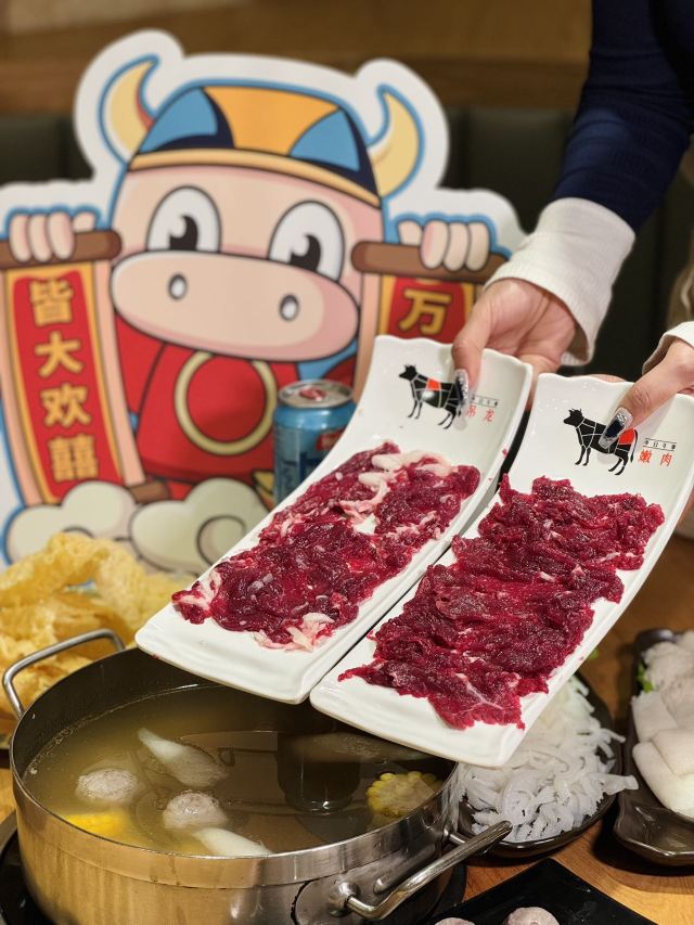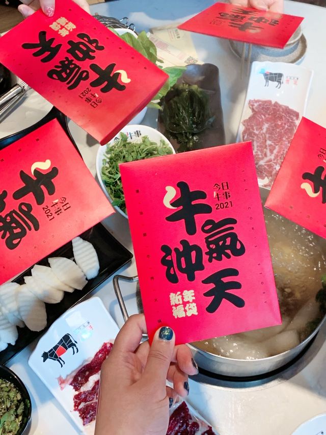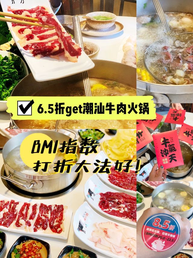 凹凸曼和小伙伴2021伊始开门红,今日牛市(事)绝对适合中小投资者们的新年聚会第一趴,口味好口彩好,牛年牛事,牛市大吉! 🔺先说说折扣,今年的今日牛事弄了个新噱头,BMI指数打折,体脂机现场测量,体脂大于33或者是低于17的,直接全单6.5折。带上你或丰腴或骨感的小伙伴,无需团购,6.5折轻松GET一顿潮汕火锅。 🔸关于点单:按人头点肉,第一轮人手一份,然后酌情添加。 🔹常规点肉三件套:「雪花」,「匙柄」,「匙皮」 「雪花」这个不是潮汕的叫法,不过,大家习惯性都会点雪花肉,不会出错的选择。 「匙柄」和「匙皮」都是肉眼部分,8秒入口。 🔸喜欢肥瘦相间的推荐:「吊龙」,「肥胼」,「胸口朥」 这个排序是从脂肪含量上说的,「胸口朥」呈白色,脆口。「肥胼」是全场最爱吧,肥瘦相间。「吊龙」也就是牛里脊,脂肪含量极少,胜在筋道。 🔹常规配菜必点「手打牛肉丸」和「手打虾丸」,没有牛肉丸和虾丸的潮汕火锅是没有灵魂的。 除此之外,说下特别惊艳的几个非常见配菜「豌豆苗」,鲜嫩可口,解忧解腻。「绣球菌」真的必点!这个值得点两轮! 因为是新年,店家还送了新年福袋,福袋里有免费的锅底券,200-38的代金券,2个新年红包以及牛年贴纸。红红火火!