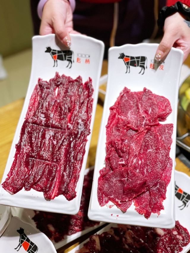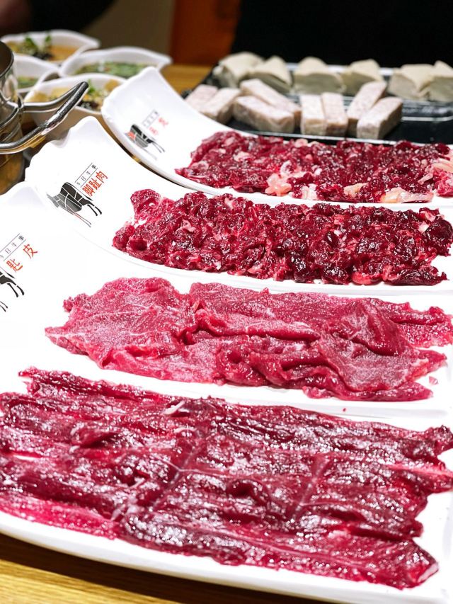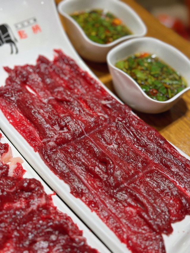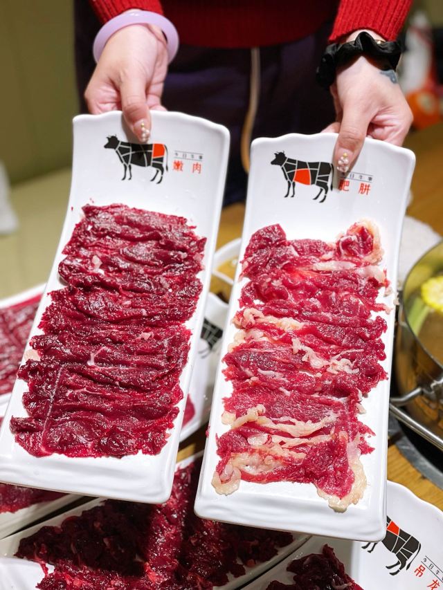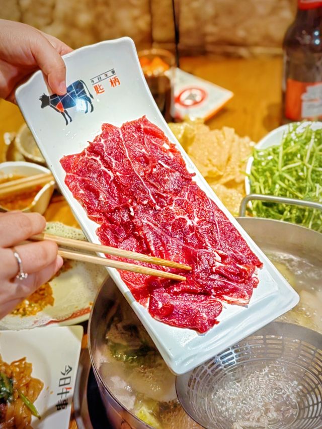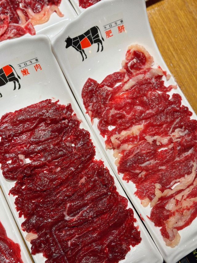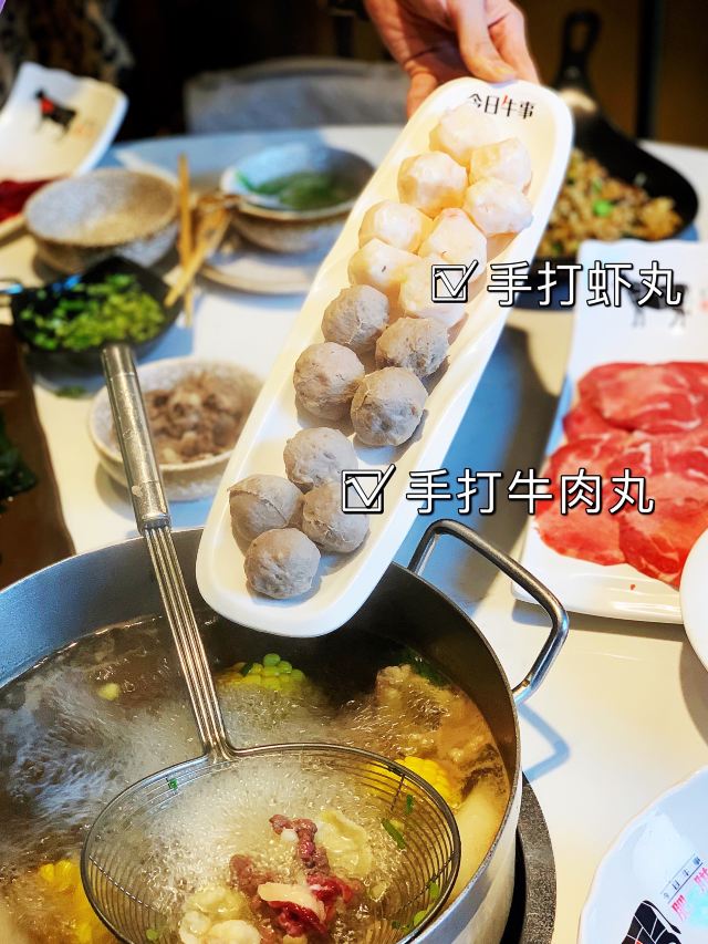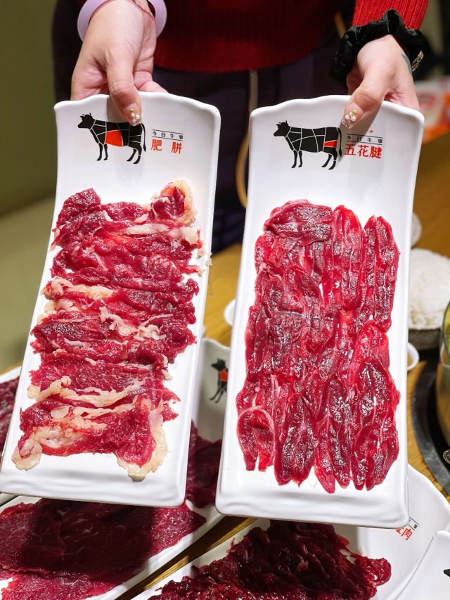 YoYo_9Z3C2S3B吃潮汕牛肉火锅就来今日牛事 潮汕旅游回来不久,又心心念念起潮汕牛肉火锅来。同事说今日牛市的牛肉和潮汕的一模一样,下班后拉着老公去过过瘾。 🍀环境:超大的店面,桌椅摆的非常宽敞,无论是二人、四人还是六人位,都比其他火锅店空间大一倍。自助料理台上的酱料质量都很赞,香菜、葱花一直保持满满的,小料都摆放很整齐。 🍀服务:服务员热情有礼,随叫随到,倒茶、加汤都很积极。 吊龙 不愧为牛肉中的顶级部位,2分油脂8分嫩肉,入锅涮12秒捞出,蘸上店里特制的沙茶酱,吃起来好满足! 匙柄 柔软多汁,带有嚼劲,弹牙脆嫩,嗲! 五花腱 有筋有肉,不柴不硬,口感富有弹性,爽口美味😋。 潮汕牛肉丸 潮汕牛肉丸真的与众不同,紧实、弹性十足,口感一级棒! 秘制凉茶 很有特色,入口有淡淡的药草味,微微甜,解腻佳品! 很正宗的潮汕火锅,这下不用去潮汕也能尝到潮汕美味啦! 🏠店名:今日牛事潮汕鲜牛肉火锅(静安寺店) 🚗地址:胶州路709号 [图片]