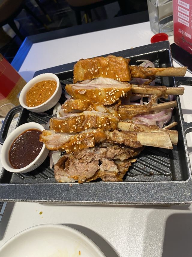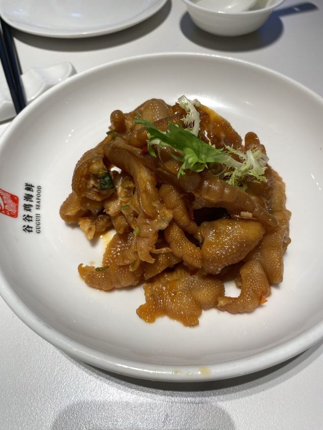 七莘路财富广场对面,一排餐厅,谷谷鸡海鲜的招牌够靓。店内分三层,二、三层是包厢,一层大厅,面积不大,七八个台子。点菜对着实物点,所以食材肯定新鲜。大大的帝王蟹来一只,摆盘和口味都很棒。羊排也很嫩,大快朵颐。