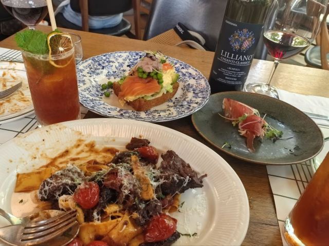 新鲜龙虾手工意面,慢炖牛脸肉意大利扁宽面,香烤春鸡,带骨肉眼牛排,新鲜生蚝,炭烤八爪鱼,小香梨和玉兰菜色拉,烟熏布拉达芝士,腌制甜虾,三文鱼三明治