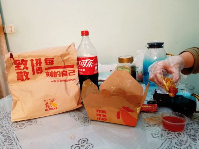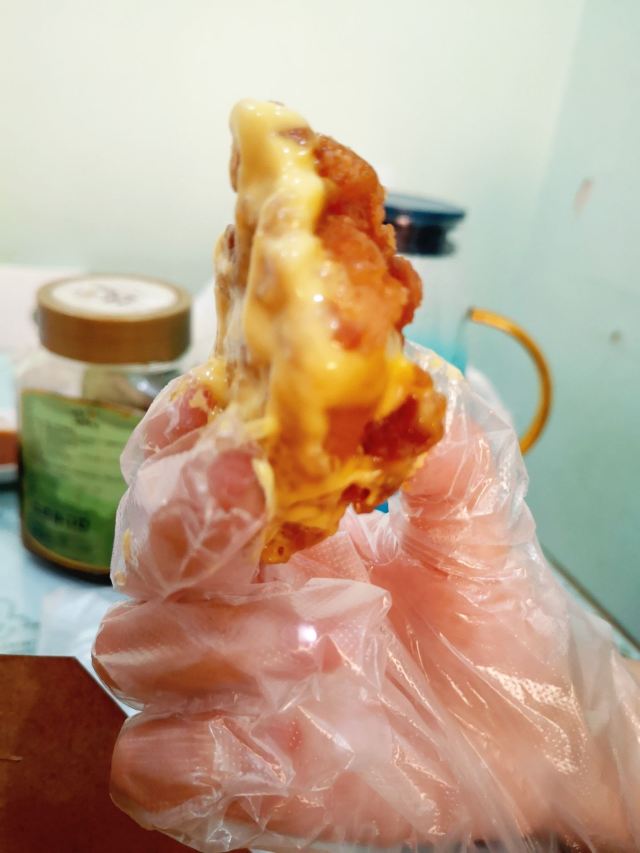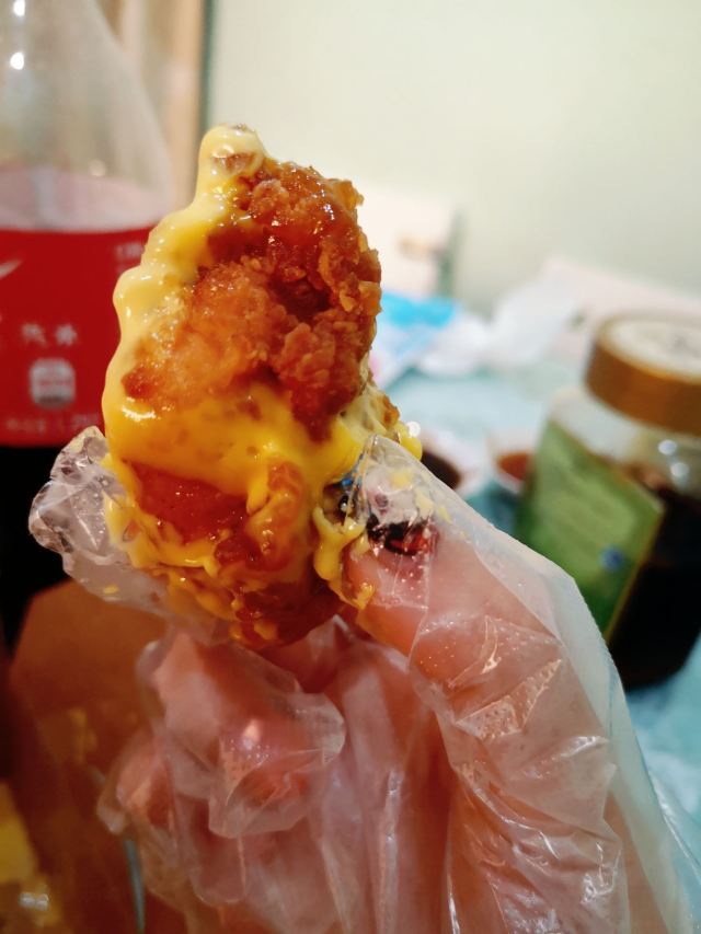 蓓家温暖我和外甥女在一起时会点些外卖改善口味这次两个人都想吃香喷喷的炸鸡,搜索了一下就点了离家最近的朴正昊韩式炸鸡。 服务:在家安心等炸鸡送上门,骑手到店后取餐后就直奔我家,所以拿到手炸鸡还很热。店家还贴心的准备了一次性手套,所以戴上手套放心的啃炸鸡吧。 |人气甜辣炸鸡^我们选的蜂蜜芥末口味炸鸡,再配了甜辣酱。这无骨鸡肉外脆里嫩,趁热吃美味极了。蘸了甜辣酱口感也相当好,这两个酱料我都喜欢。 有了炸鸡再来罐啤酒?不不不,我们不喝酒。来瓶大容量的快乐水,倒在杯子里,吃了炸鸡再咕咚咕咚喝几口可乐,然后一个满意的咯就打出来了,来干杯,再来块炸鸡!