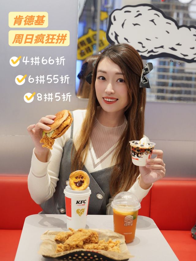 双11的疯狂只限一年一次 肯德基的疯狂每周都不停 当大家都在劝你花钱💸 只有肯德基替你省钱💰 15款产品全场任‼️意‼️拼‼️ 汉堡🍔炸鸡🍗甜品🍨饮品🍹 4拼66折、6拼55折、8拼5折 拼🉐️越多 省🉐️越多 不需要好友助力 就是这么给力‼️ 咸派可以这样点👇 黄金SPA鸡排堡🍔8.7r 热辣香骨鸡🐔6.3r 香辣鸡翅🍗6.3r 劲爆鸡米花(小)🍤6r 甜派可以这样点👇 原味圣代黑糖珍珠酱🍨5.8r 葡式蛋挞🥧4r 爆汁柠桔茶🍹6.5r 百事(中)🥤4.8r 一到周日就要玩疯肯德基 完全不用考虑钱包的感受 11月13日~12月4日连续4个周日 下单就有机会抽五菱宏光MINIEV KFC周日疯狂拼 比双11还给力‼️