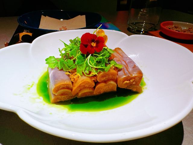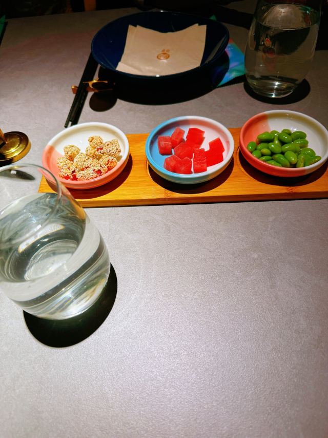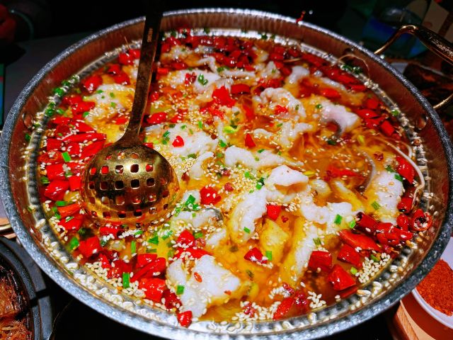 旺池,意为“月光照耀之城”,住在城里的人们信仰日月,以木屋为家,以豆为食,传承着古老的编织技艺⋯这个品牌诞生于2012年,是以经典川味为主、融合川滇藏交汇的川式风味美食,以“豆”为特色,辣中藏鲜,酣畅健康又好吃的创新川菜。今天中午和友人就在旺池品萃里吃个午餐吧。 环境:位于新世界8楼,门面并不大,但走进餐厅别有洞天,店内有小巧的卡座也有宽阔的长桌,也有包房,整体色调以低饱和度的藏青和粉紫为主,角落里点缀着绿色植物,加上朦胧的软纱隔断,格调雅致的氛围中少了喧哗声,一坐下就感受到静谧和舒适! 服务:接待我们的小姐姐热情规范,专业细致,让人感觉很舒服。 【水煮江团鱼】作为每桌必点的招牌菜,用的是贡品级江团鱼,现点现杀,鱼肉细腻鲜美,红红的辣椒和花椒香气浓郁,鲜辣的汤汁立马激起食欲,里面还有豆芽、莴笋片等辅料,脆嫩可口。 【川萃招牌烤鸡】用的是竹林鸡用辛香料腌制,8小时风干后再1小时小火慢烤,上桌时皮脆,鸡肉软弹入味,油润中又带着干香。 【铁板蒜蓉生焖虾】端上桌来还吱吱作响,虾肉Q弹,粉丝浸润了汁水,很入味。 【醋汁杭茄子】摆盘很漂亮,茄子酸中带辣,作为开胃菜真的很适合。 【樱花虾豆汤嫩豆苗】清脆爽口的嫩豆苗解腻味美。 【红糖黑米糍粑】放在小竹篮里的黑米糍粑外焦里糯又香。 坐在莫兰迪色的月下芙蓉城里品着麻辣鲜香的川菜,心和味蕾都满足了,真的很喜欢这种仪式感满满又充满静谧、美好的感觉。