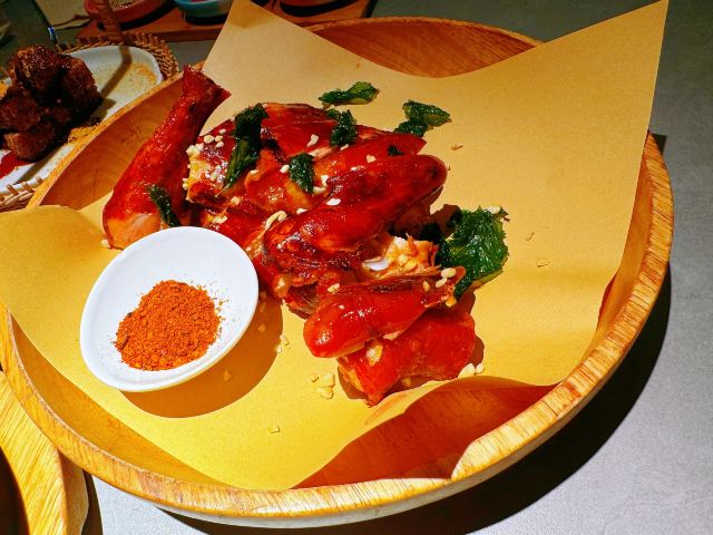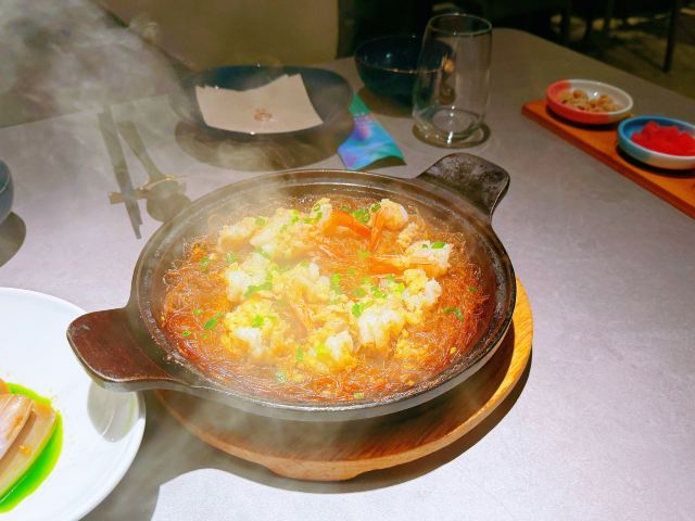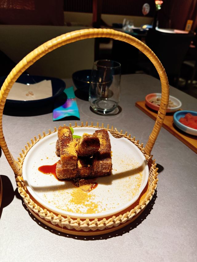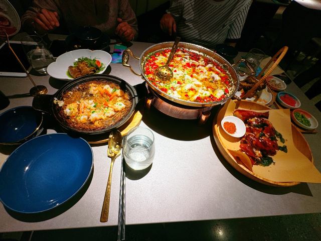 蓓家温暖旺池,意为“月光照耀之城”,住在城里的人们信仰日月,以木屋为家,以豆为食,传承着古老的编织技艺⋯这个品牌诞生于2012年,是以经典川味为主、融合川滇藏交汇的川式风味美食,以“豆”为特色,辣中藏鲜,酣畅健康又好吃的创新川菜。今天中午和友人就在旺池品萃里吃个午餐吧。 环境:位于新世界8楼,门面并不大,但走进餐厅别有洞天,店内有小巧的卡座也有宽阔的长桌,也有包房,整体色调以低饱和度的藏青和粉紫为主,角落里点缀着绿色植物,加上朦胧的软纱隔断,格调雅致的氛围中少了喧哗声,一坐下就感受到静谧和舒适! 服务:接待我们的小姐姐热情规范,专业细致,让人感觉很舒服。 【水煮江团鱼】作为每桌必点的招牌菜,用的是贡品级江团鱼,现点现杀,鱼肉细腻鲜美,红红的辣椒和花椒香气浓郁,鲜辣的汤汁立马激起食欲,里面还有豆芽、莴笋片等辅料,脆嫩可口。 【川萃招牌烤鸡】用的是竹林鸡用辛香料腌制,8小时风干后再1小时小火慢烤,上桌时皮脆,鸡肉软弹入味,油润中又带着干香。 【铁板蒜蓉生焖虾】端上桌来还吱吱作响,虾肉Q弹,粉丝浸润了汁水,很入味。 【醋汁杭茄子】摆盘很漂亮,茄子酸中带辣,作为开胃菜真的很适合。 【樱花虾豆汤嫩豆苗】清脆爽口的嫩豆苗解腻味美。 【红糖黑米糍粑】放在小竹篮里的黑米糍粑外焦里糯又香。 坐在莫兰迪色的月下芙蓉城里品着麻辣鲜香的川菜,心和味蕾都满足了,真的很喜欢这种仪式感满满又充满静谧、美好的感觉。