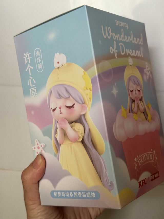 🆘KFC✖️POP MART BUNNY 联手骗欠啦 十一小假开抢 购肯德基指定🍑 即可获得泡泡玛特得联名香氛蜡烛 (随机4选1) 欧中许个星愿(海洋调)最🥰的一款 戴着睡帽BUNNY还怪可爱叻 🌙✨这个香味个人认为还不错 连空气都带着一丝甜味