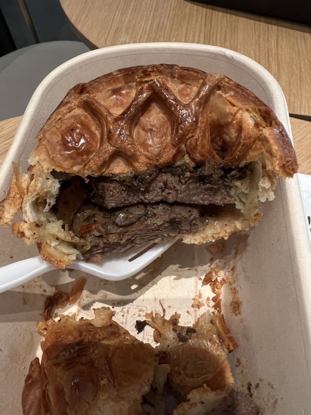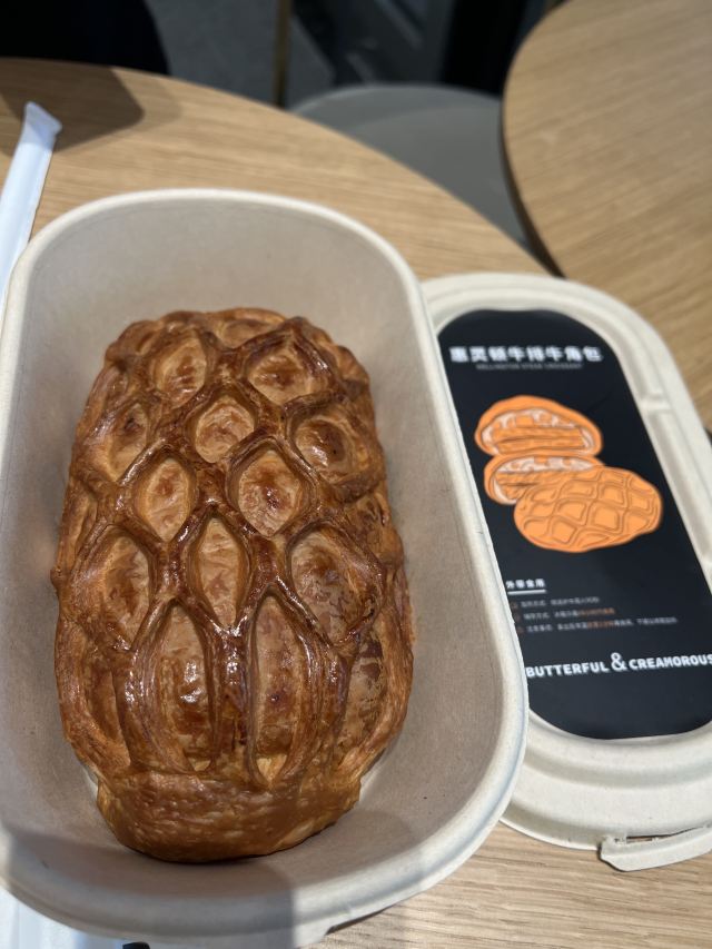 【口味】 |战斧牛排惠灵顿牛角包^98元/个,性价比很高,因为真的很大一个,而且战斧牛排是调味过的,味道很ok,外面酥皮也很好吃,绝对可以试试~ 【环境】 环境不是很大,没有室内堂吃位,只有室外的,这天坐室外有点热~