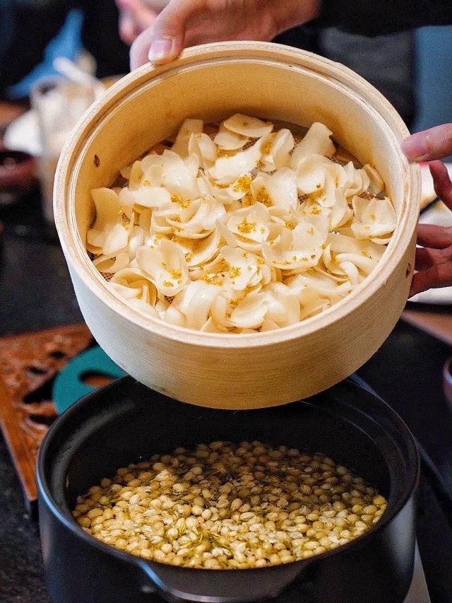 加油干饭呀吃腻了寻常菜,这次来品尝点不一样的美味,茗膳里带你走进私房菜的静谧时光🍃 一个“膳”字就代表了“珍稀、珍贵”之意,每一道菜品都倾注了厨师的美味故事与趣味人生,对于每个吃货而言,也是对美食的终极追求。 绍兴路上的独栋门户,所谓酒香不怕巷子深,虽坐落于闹市,装修却给人悠然自得的舒适感,清雅幽静,沉稳大气,有着商业街区感受不到的韵味。 菜品惊艳脱俗,上菜有条不紊,周到贴心的服务有种宾至如归的亲切。在这里,会愿意花时间走过每一个角落,与三两好友饮酒聚餐谈天说地🍷 🦀️黑豚肉蒸红蟹🦀️ 上桌就是一整只拆分好的红蟹,不似膏蟹与帝王蟹,红蟹肉质更加细腻,垫底的黑豚肉与螃蟹完美融合,咸鲜之中带着一丝丝鲜甜 🦢拆骨鹅掌🦢 将鹅掌剔骨是一个极其考验刀功的技术活,恰恰这道菜品完全做到了鹅掌骨拆而肉不烂,鹅掌软硬适中,搭配咸淡适中的酱汁调味,令人回味无穷! 🦩核桃鹅肝🦩 鹅肝被制作成核桃的形状,栩栩如生的逼真造型,轻盈口感真是太奇妙了,质地有点像入口即化的戚风蛋糕,完全没有鹅肝的肥腻 🌼茉莉花香薰九年百合🌼 将百合放入蒸笼中,用沙漏倒计时蒸上12分钟⌛️百合入口即化,有一股淡淡的清甜,搭配咸口的菜品和日光米,一小碗的米饭恰到好处🍚 🏡茗膳里 📍绍兴路23号2号楼1层