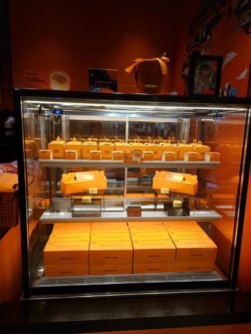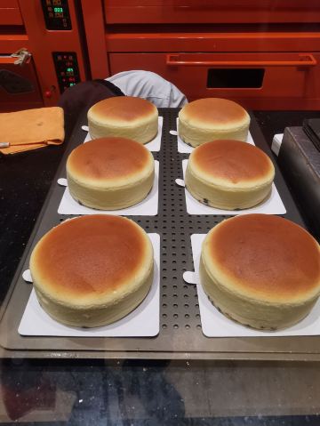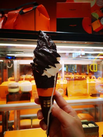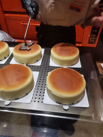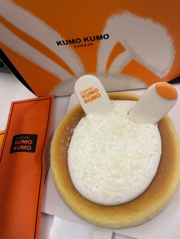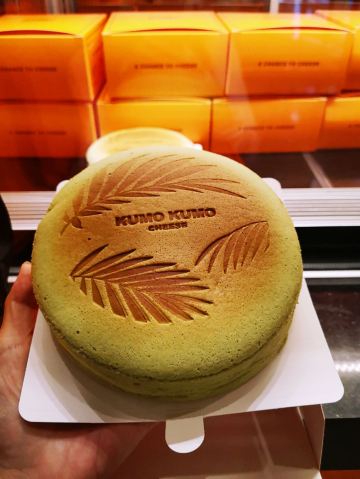 去环球港购物被一阵清脆的摇铃声吸引,一抹熟悉的爱马仕橙色,原来是魔都排队王芝士蛋糕品牌KUMO KUMO家蛋糕刚制作完成。新出的梦龙黑巧芝士蛋糕每日出炉时间是12:30分,全天限量23份,每人限购一份。爱尝新品的我肯定要加入排队大军了。 环境:KUMO KUMO特色就是让消费者看到透明的手工现制过程,开放式厨房摆放着全套橙色定制的烘焙设备,整洁明亮的环境和店员行云流水的操作让等待也成为更多期待。 服务:店员分工明确,操作台前向消费者展现着从蛋糕制胚到烘烤、烙印再到经典的摇铃告知,带着标准化和仪式感,每日限量版的梦龙黑巧芝士蛋糕在准备期间就会有店员在店面前竖起栏杆让大家有序排队并发放纸牌确认,对顾客有问必答,礼貌招呼和送别服务规范又热情。 |芝士牛乳冰淇淋^排队一个多小时,观看蛋糕制作全过程间隙吃了一个芝士牛乳冰激凌,甜中微咸的芝士冰激凌绵密、冰凉碰撞在舌尖带来满嘴浓郁醇香。 |至臻黑巧脆皮芝士蛋糕^巧克力达人不容错过的这款新品,表面淋满浓醇巴旦木碎的黑巧脆皮,切开后经典原味芝士和可可芝士蛋糕中间铺了一层赛尔维亚树莓酱夹心,带来了冰凉、醇苦、清脆、果香、柔软的5个层次口感,没有想象中的甜腻,是我喜欢的口感。 |斑斓椰椰芝士蛋糕^淡绿色蛋糕表面印上了斑斓叶图案,绵密软糯的蛋糕里有着细细的椰肉,中间还有椰蓉夹心酱,带着椰子味清香最适夏天了。 成年人不做选择题,喜欢就是都要,今日买的新品都给我无限惊喜,你可以永远相信KUMO KUMO。
