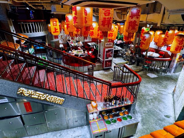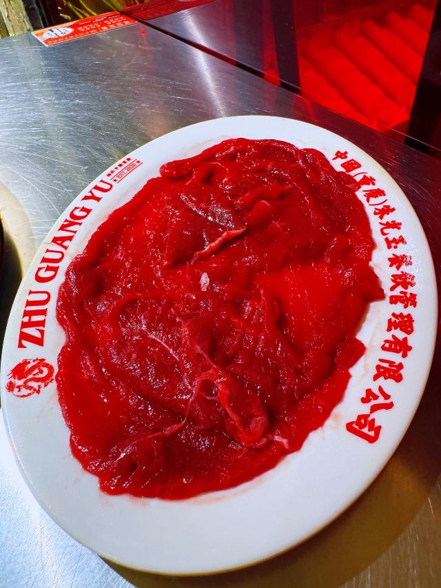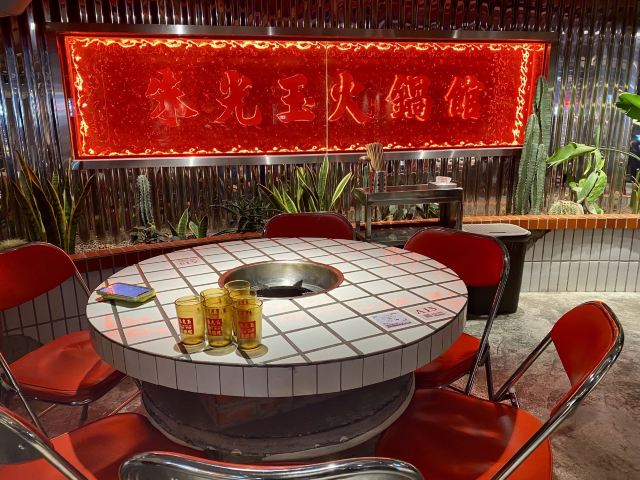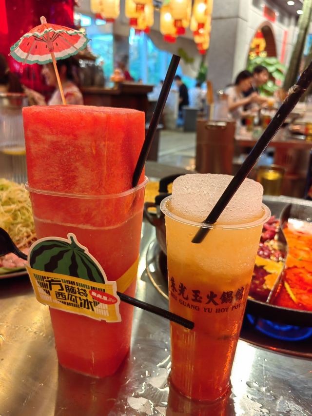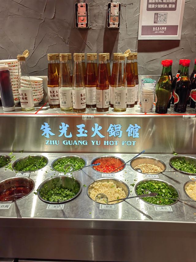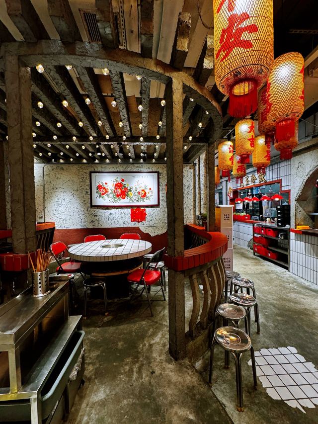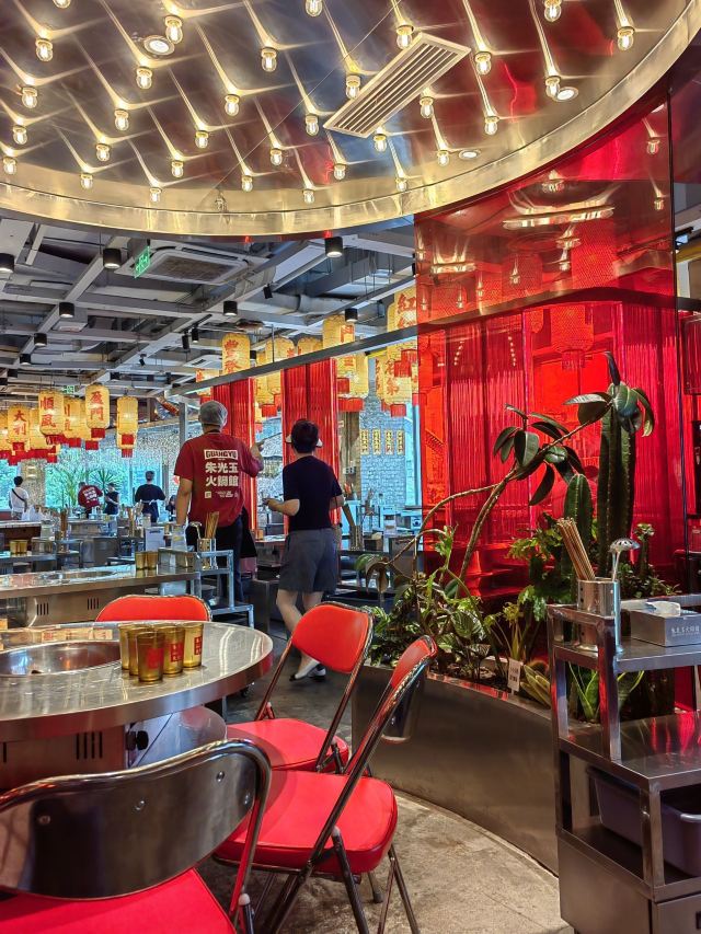 如果说人间烟火气,最抚凡人心,那火锅绝对能称得上是烟火气最具代表性的存在。今天和朋友一起打卡人民广场排队王朱光玉火锅。事先打过预定用餐电话,中午早过来还是要在外面等好久才被安排入座。 环境: 进入店内结合多元素废墟风空间混搭,吉庆灯笼、金字招牌、瓷砖灶台、小院门、绿植和最具烟火气代表的明档厨房,不仅让人眼前一亮。甚至还能看到街头气十足的炒饭档口,颠勺的师傅将米饭和丰富的配料上下翻炒,锅气十足。现蒸现包的包子和暴打柠檬及颜值口味在线的甜品,看了就想吃。 服务:人手明显不够,导致2楼有空座也没让食客进入。 门口有店员安排食客拿号依次等位,但对预定的客人交接不明确,导致还要等待,不过我入座后仔细问过店员解释其实店方并不接受电话预约,还是以现场排号为主。好在店员态度都是非常诚恳,有问必答,忙忙碌碌的身影穿梭在餐桌间,这一天的工作量也是比较大的。 【随心四拼锅】自己随心搭配组合,我选牛油红汤、番茄、菌菇、猪肚鸡,真的各有特色,每个锅底食材都有。 【嫩牛肉】端上来火红的牛肉看上去就很新鲜,经过涮烫后入口扎实的牛肉的确鲜嫩。 【老肉片】选取猪身上叫做“眉毛肉”又称梅花肉的位置,粉嫩鲜肉与丝丝白色油脂面形似梅花,其肉质鲜美可口,久煮不老,真心好吃。 【鸭肠毛肚双拼】脆爽滑嫩的鸭肠其实放在辣锅里吃起来更入味,再来一大片爽嫩毛肚,在嘴里嘎嘣嘎嘣特别带感。 【瀑布鱿鱼片】薄切的一整片鱿鱼脆脆弹弹,有嚼劲。 【千丝土豆】吃起来口感脆爽弹牙,每一根土豆丝都能挂满火锅汤汁,丝丝入味。 【酱肉包】里面的酱肉馅调味得咸淡适当,而且是师傅现包的,而大多数食客会把包子放进火锅里煮着吃,很快酱肉包就吸满了汤汁和红油,来了就尝试一下呗。 【千丝豆干】吃起来既有豆干特有的韧性和嚼劲,又因为切得细,所以口感更加细腻,非常的入味。 【黑糖乌龙牛乳冰】乌龙牛乳冰打底,黑糖珍珠一颗颗糯叽叽,上面是滑爽的布丁,冰冰凉凉奶香十足,给嘴里降降火,吃了及其舒适。 和好友在复古感十足的氛围里谈天说地,四宫格的锅底总有一款适合你,在火锅的翻滚中,找寻生活的滋味,品味每一刻的热烈与欢聚。