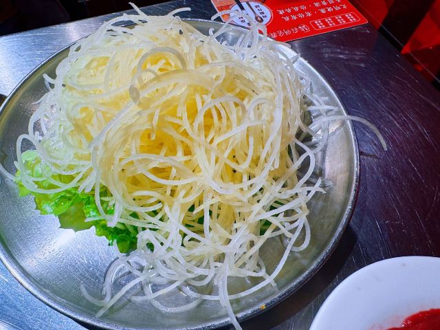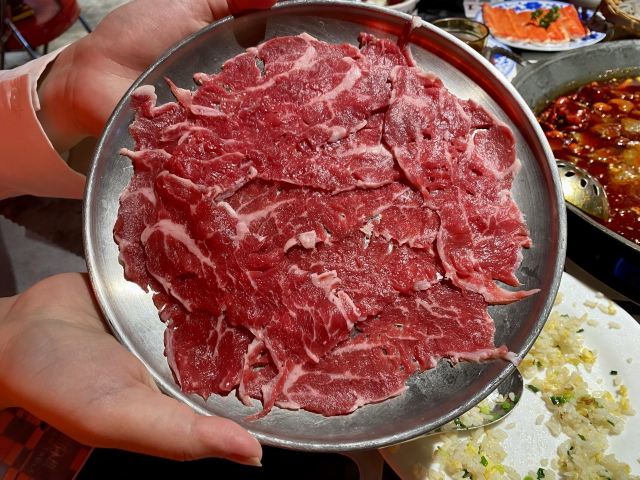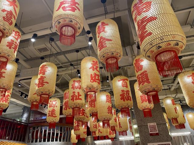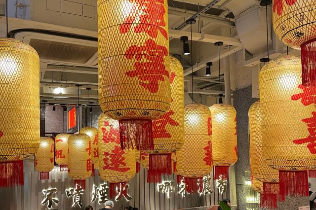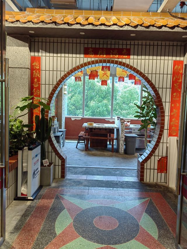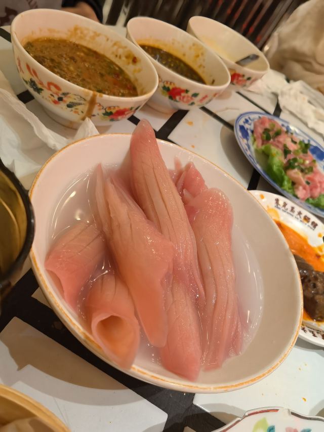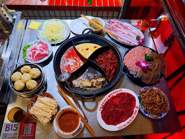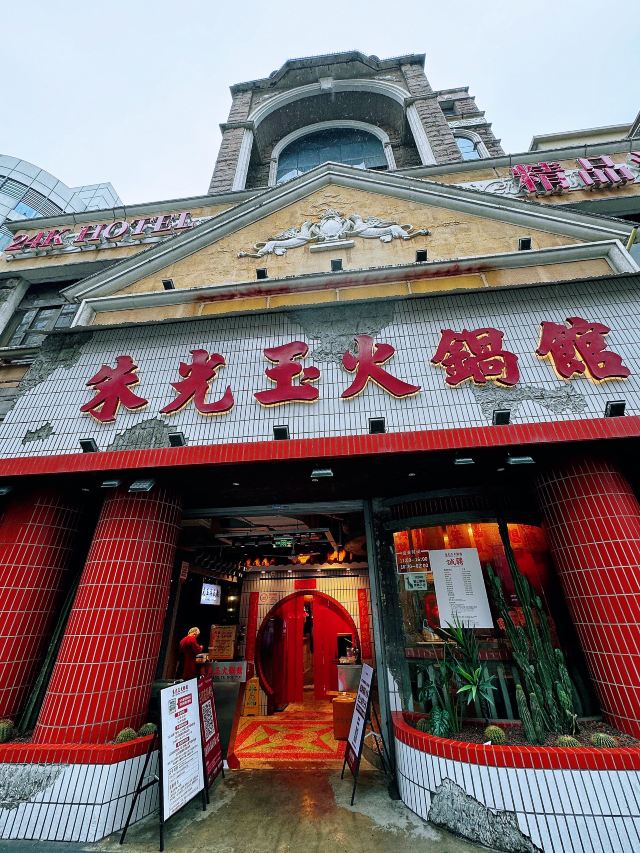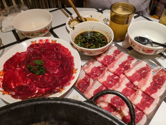 如果说人间烟火气,最抚凡人心,那火锅绝对能称得上是烟火气最具代表性的存在。今天和朋友一起打卡人民广场排队王朱光玉火锅。事先打过预定用餐电话,中午早过来还是要在外面等好久才被安排入座。 环境: 进入店内结合多元素废墟风空间混搭,吉庆灯笼、金字招牌、瓷砖灶台、小院门、绿植和最具烟火气代表的明档厨房,不仅让人眼前一亮。甚至还能看到街头气十足的炒饭档口,颠勺的师傅将米饭和丰富的配料上下翻炒,锅气十足。现蒸现包的包子和暴打柠檬及颜值口味在线的甜品,看了就想吃。 服务:人手明显不够,导致2楼有空座也没让食客进入。 门口有店员安排食客拿号依次等位,但对预定的客人交接不明确,导致还要等待,不过我入座后仔细问过店员解释其实店方并不接受电话预约,还是以现场排号为主。好在店员态度都是非常诚恳,有问必答,忙忙碌碌的身影穿梭在餐桌间,这一天的工作量也是比较大的。 【随心四拼锅】自己随心搭配组合,我选牛油红汤、番茄、菌菇、猪肚鸡,真的各有特色,每个锅底食材都有。 【嫩牛肉】端上来火红的牛肉看上去就很新鲜,经过涮烫后入口扎实的牛肉的确鲜嫩。 【老肉片】选取猪身上叫做“眉毛肉”又称梅花肉的位置,粉嫩鲜肉与丝丝白色油脂面形似梅花,其肉质鲜美可口,久煮不老,真心好吃。 【鸭肠毛肚双拼】脆爽滑嫩的鸭肠其实放在辣锅里吃起来更入味,再来一大片爽嫩毛肚,在嘴里嘎嘣嘎嘣特别带感。 【瀑布鱿鱼片】薄切的一整片鱿鱼脆脆弹弹,有嚼劲。 【千丝土豆】吃起来口感脆爽弹牙,每一根土豆丝都能挂满火锅汤汁,丝丝入味。 【酱肉包】里面的酱肉馅调味得咸淡适当,而且是师傅现包的,而大多数食客会把包子放进火锅里煮着吃,很快酱肉包就吸满了汤汁和红油,来了就尝试一下呗。 【千丝豆干】吃起来既有豆干特有的韧性和嚼劲,又因为切得细,所以口感更加细腻,非常的入味。 【黑糖乌龙牛乳冰】乌龙牛乳冰打底,黑糖珍珠一颗颗糯叽叽,上面是滑爽的布丁,冰冰凉凉奶香十足,给嘴里降降火,吃了及其舒适。 和好友在复古感十足的氛围里谈天说地,四宫格的锅底总有一款适合你,在火锅的翻滚中,找寻生活的滋味,品味每一刻的热烈与欢聚。