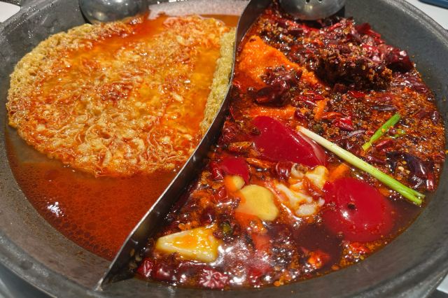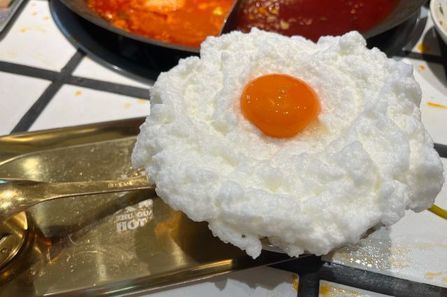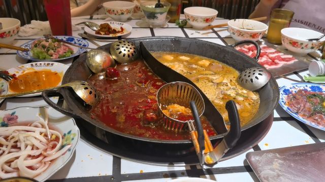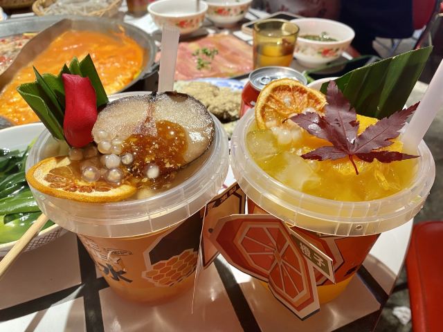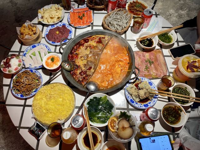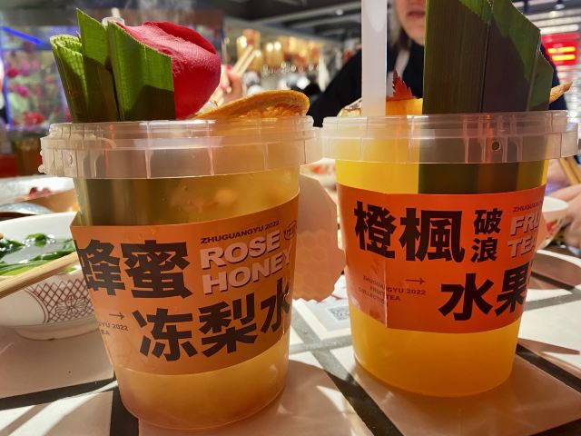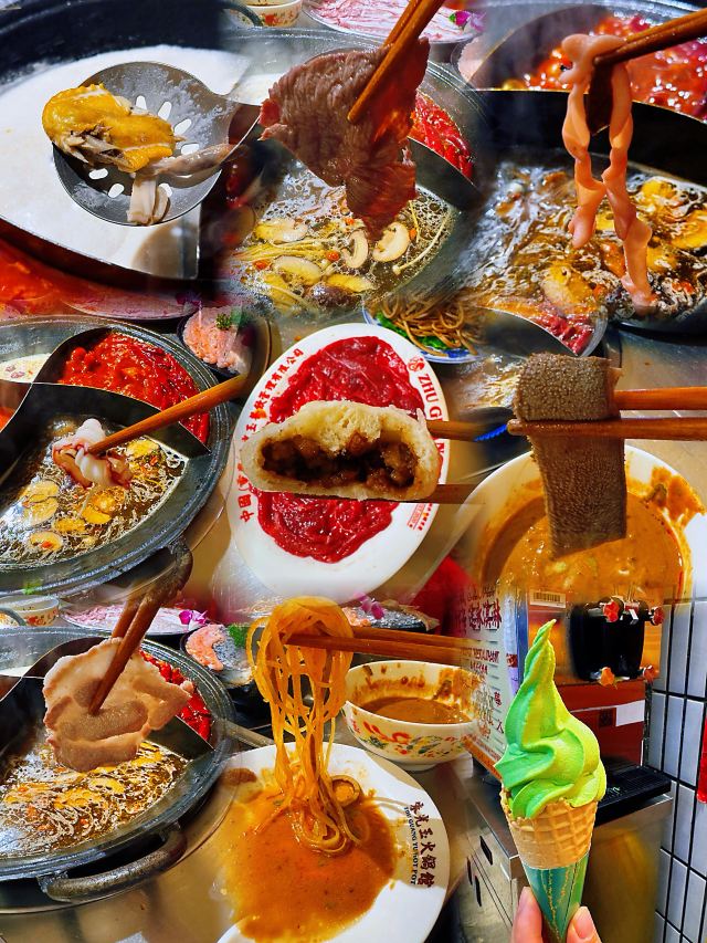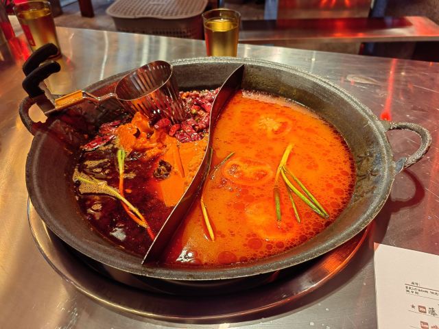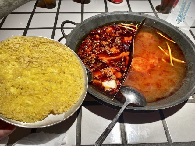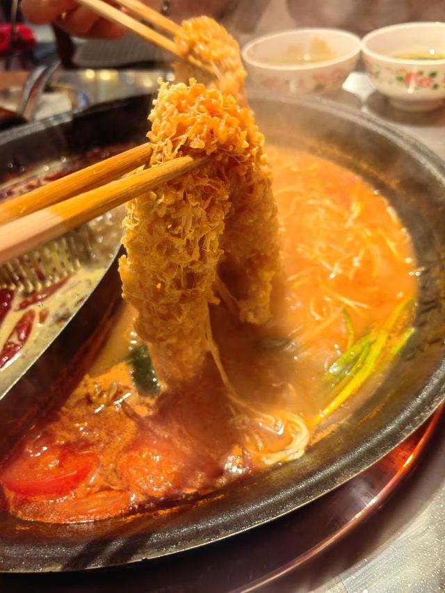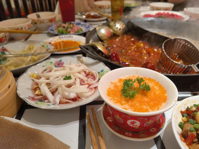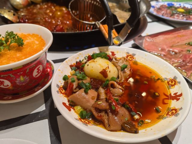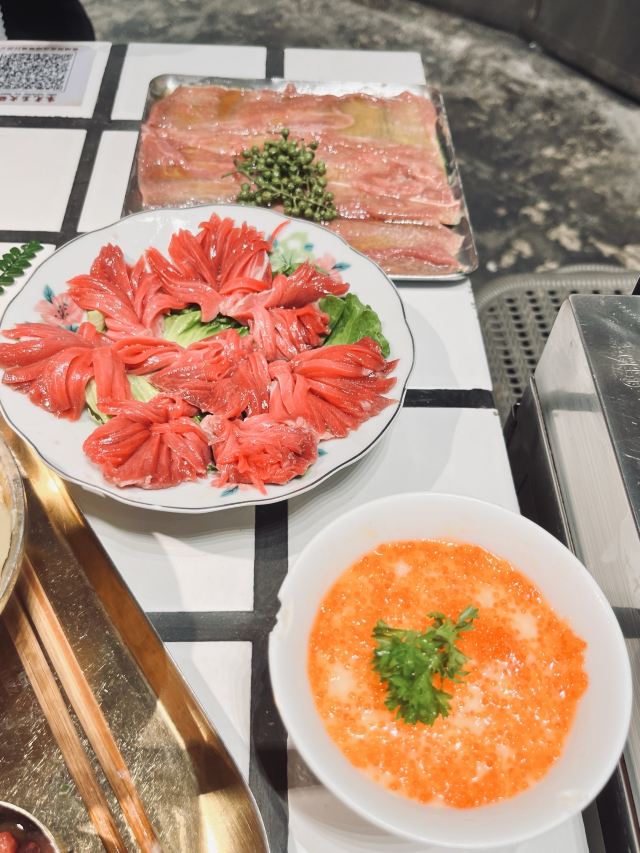 YoYo_9H7Y6C3X这家店实在是太火爆了,动不动几百个号,真是吓si个人。这次是4点半准时线上取号的,然后算准时间去,现场大概排队半小时左右。 「番茄红油鸳鸯锅」辣锅选的微辣,感觉完全能够接受,喜辣的朋友可以选择中辣或重辣,不然不过瘾的。番茄锅送了炸蛋,真是挺好吃的。 「藤椒牛舌」是脆脆的口感,藤椒微麻,配着辣锅很赞 「虎皮凤爪」这个记得点,而且建议涮久一些,入口即化的口感才瞬间令人心满意足。 推荐「嫩牛肉」而别点「肥牛卷」,真的嫩,涮久了也嫩 「太阳蛋绵云牛乳冰」这个真的很让人一言难尽,不知道该如何形容它的味道,咸咸甜甜,总之味道怪怪的,造型挺不错 「整颗菠萝水果茶」「心想柿橙水果茶」两个水果茶都不错,菠萝水果茶是香水柠檬底加菠萝,柿橙水果茶是橙汁底加柿子,柿子需要自己挤进去 「番茄芝士肉酱包」这个一般吧,有芝士味吗? 总体味道还可以,人均130左右,点评打卡收藏送哈根达斯冰激凌一份。如果不需要排队,我还是愿意再去的🤭