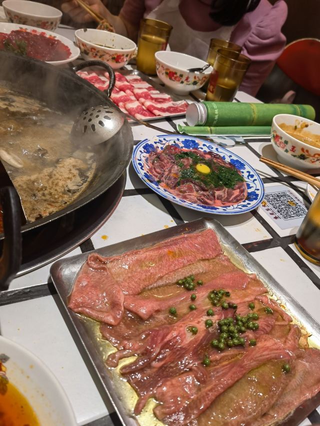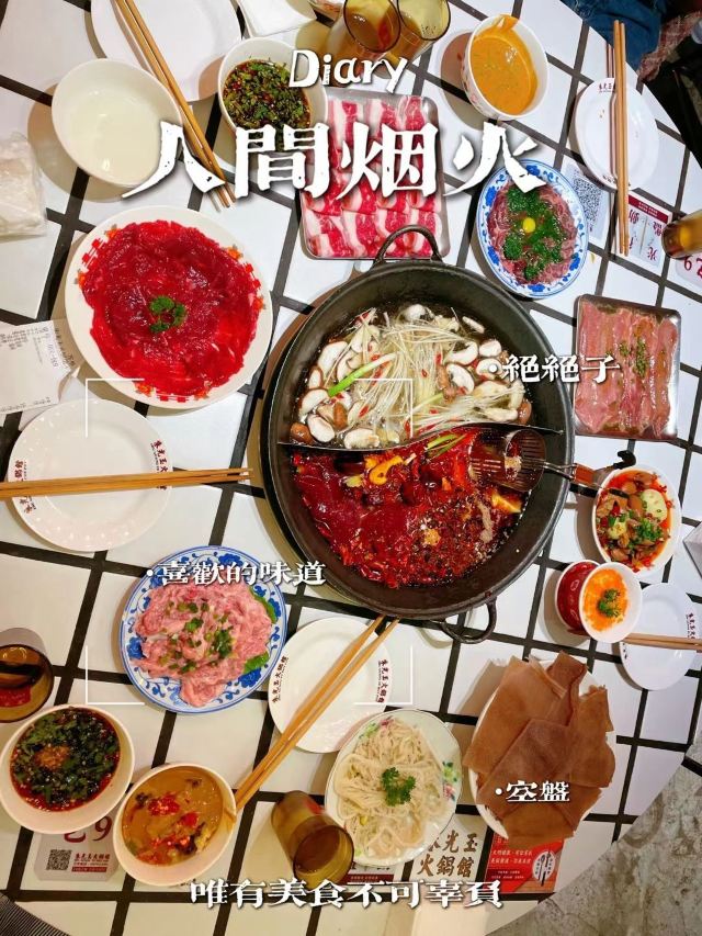 蓓家温暖如果说人间烟火气,最抚凡人心,那火锅绝对能称得上是烟火气最具代表性的存在。今天和朋友一起打卡人民广场排队王朱光玉火锅。事先打过预定用餐电话,中午早过来还是要在外面等好久才被安排入座。 环境: 进入店内结合多元素废墟风空间混搭,吉庆灯笼、金字招牌、瓷砖灶台、小院门、绿植和最具烟火气代表的明档厨房,不仅让人眼前一亮。甚至还能看到街头气十足的炒饭档口,颠勺的师傅将米饭和丰富的配料上下翻炒,锅气十足。现蒸现包的包子和暴打柠檬及颜值口味在线的甜品,看了就想吃。 服务:人手明显不够,导致2楼有空座也没让食客进入。 门口有店员安排食客拿号依次等位,但对预定的客人交接不明确,导致还要等待,不过我入座后仔细问过店员解释其实店方并不接受电话预约,还是以现场排号为主。好在店员态度都是非常诚恳,有问必答,忙忙碌碌的身影穿梭在餐桌间,这一天的工作量也是比较大的。 【随心四拼锅】自己随心搭配组合,我选牛油红汤、番茄、菌菇、猪肚鸡,真的各有特色,每个锅底食材都有。 【嫩牛肉】端上来火红的牛肉看上去就很新鲜,经过涮烫后入口扎实的牛肉的确鲜嫩。 【老肉片】选取猪身上叫做“眉毛肉”又称梅花肉的位置,粉嫩鲜肉与丝丝白色油脂面形似梅花,其肉质鲜美可口,久煮不老,真心好吃。 【鸭肠毛肚双拼】脆爽滑嫩的鸭肠其实放在辣锅里吃起来更入味,再来一大片爽嫩毛肚,在嘴里嘎嘣嘎嘣特别带感。 【瀑布鱿鱼片】薄切的一整片鱿鱼脆脆弹弹,有嚼劲。 【千丝土豆】吃起来口感脆爽弹牙,每一根土豆丝都能挂满火锅汤汁,丝丝入味。 【酱肉包】里面的酱肉馅调味得咸淡适当,而且是师傅现包的,而大多数食客会把包子放进火锅里煮着吃,很快酱肉包就吸满了汤汁和红油,来了就尝试一下呗。 【千丝豆干】吃起来既有豆干特有的韧性和嚼劲,又因为切得细,所以口感更加细腻,非常的入味。 【黑糖乌龙牛乳冰】乌龙牛乳冰打底,黑糖珍珠一颗颗糯叽叽,上面是滑爽的布丁,冰冰凉凉奶香十足,给嘴里降降火,吃了及其舒适。 和好友在复古感十足的氛围里谈天说地,四宫格的锅底总有一款适合你,在火锅的翻滚中,找寻生活的滋味,品味每一刻的热烈与欢聚。
