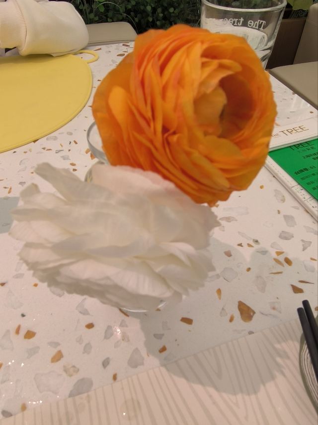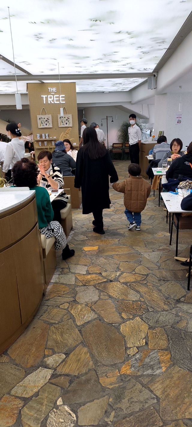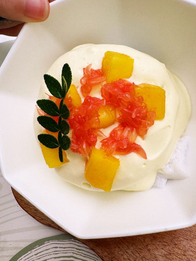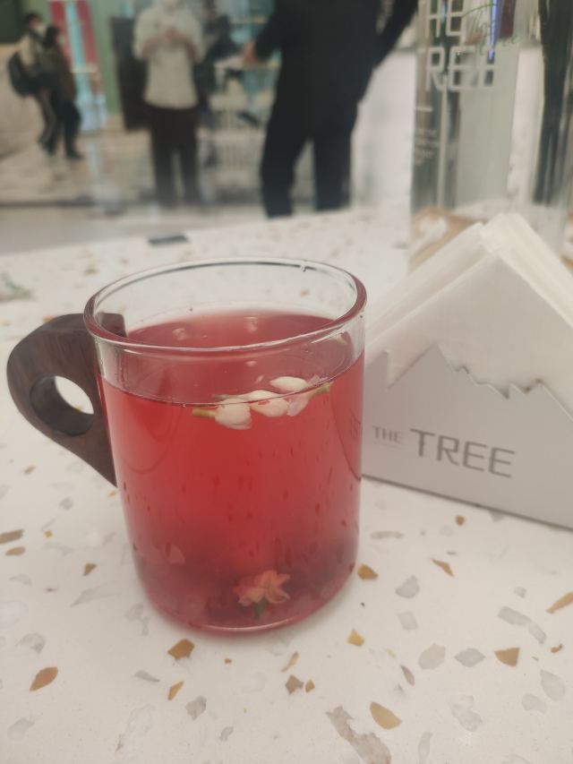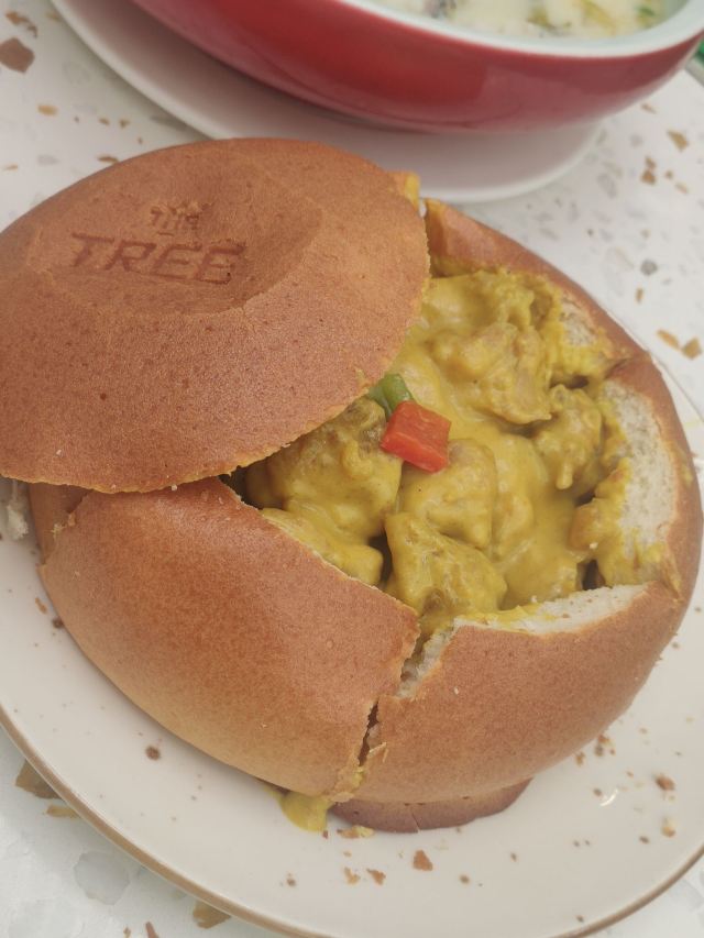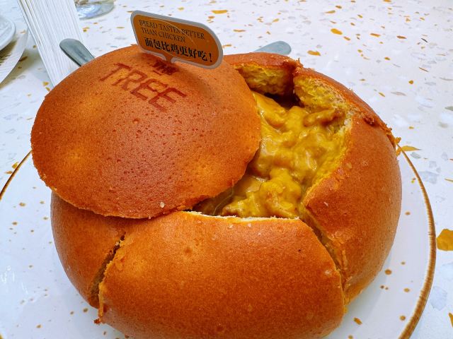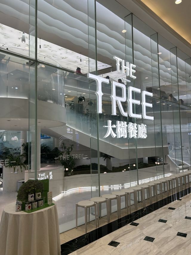 和家人来环球港逛逛,平日等不到座的大树餐厅看上去等位人不是很多那今天肯定能吃到了。 环境:全透明的落地玻璃敞亮的白色系ins风装修,白色纸幔云朵造型,堆叠出层次感,设计感十足。无处不在的绿植,融进整个设计中,仿佛是在森林里就餐,又仿佛是在天空之境,如此虚实结合的景象,着实让人舒心愉悦。 服务:门口拿号等位,服务生及时提醒前面有6桌,不要走开,不用等很久就能入座就餐,顺利入座后点单很顺利,上菜等了一段时间,期间服务生忙而有序,服务热情规范,只要有招呼马上过来,上菜间隙及时撤走空盘,礼貌迎送客,做得不错。 【咖喱面包鸡】排名第一的咖喱面包鸡每桌必点,第一口嫩滑的鸡肉被椰香浓郁的咖喱包裹着已经很惊艳,没想到松软带着酥皮的面包蘸饱咖喱汁越吃越上头,果然跟指示牌上写的一样,面包比鸡更好吃,诚不欺我! 【大树白芥虾】弹滑可口的大虾仁外裹了沙拉酱蘸点秋葵碎,酸甜中淡淡的芥末味道感觉清新适口。 【巴旦木雪花牛肉粒】鲜嫩多汁的牛肉粒和爽滑的杏鲍菇再来一口香脆的巴旦木,黑胡椒风味的完美结合,爱了。 【大树奶酸鱼】大块新鲜鱼肉和脆爽的酸菜加了熬了奶白奶白的汤汁,酸辣鲜香,回味微辣喝了一碗接一碗停不下来的节奏。 【黑芝麻慕斯蛋糕碗】慕斯丝滑浓郁的黑芝麻味在味蕾中 弥漫,下面有松软的蛋糕,两片香脆的芝麻薄片和有嚼劲的黑白小珍珠增加了层次感。 【杨枝甘露盖碗】清新可口的杨枝甘露和耶冻下面还有蛋糕基底,这道甜品我喜欢。 来大树招牌菜都点了,每个都不错,餐后甜品也是不能少的,新粤菜还是很对我们的胃的。