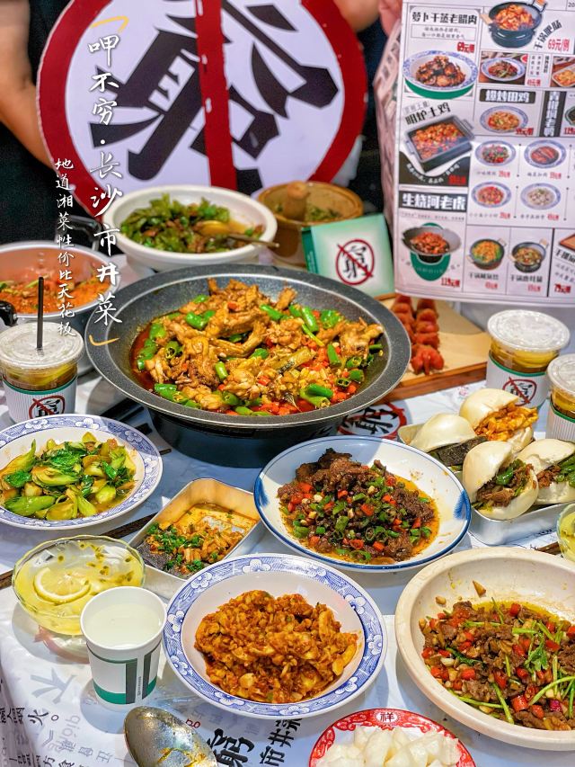 呷不穷·长沙市井菜|宝藏湘菜一观,随便呷,呷不穷 姐妹们,又发现了一家宝藏湘菜,今天带你们来看看哦~“呷”在长沙话里是“吃”的意思,那么这个店的宗旨就是让你随便吃,吃不穷啦~ 味道特别好,据说是文和友的厨师团队哦!好吃不贵,味道也很地道~可谓是湘菜性价比天花板! 金钱蛋,鸡蛋🥚过油炸了道,外皮金黄带点儿微脆,微辣微麻的酱料好入味~土鸡蛋也很鲜美,不愧是招牌菜呢! 香辣紫苏牛蛙,好大一份量很大呢,牛蛙肉好嫩~紫苏还有去寒理气的功效,这道养生牛蛙不得不吃呀! 擂椒皮蛋,这道是很经典的湘菜,几乎我去每家湘菜店都会点~呷不穷家的味道很正宗,辣椒是产自湖南的,所以就很原汁原味,够辣够劲儿~把辣味都擂出来,渗透到皮蛋里去,这滋味,不要太开胃哦!就光这菜就能多吃一碗饭~ 永州血鸭,这道菜上过舌尖上的中国哒!湖南名菜,香辣可口,特别下饭~ 手打茉莉绿柠檬水🍋,吃辣辣的菜就必须配冰爽的饮料,柠檬水很解辣,还有茉莉的清香缭绕,舒缓了整个辣意~