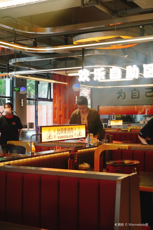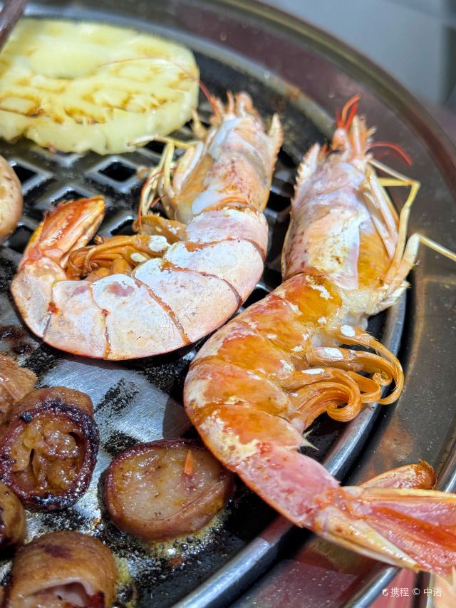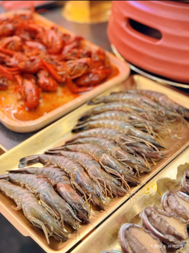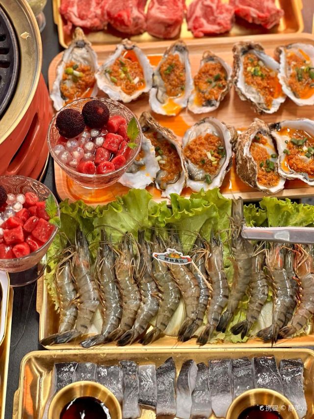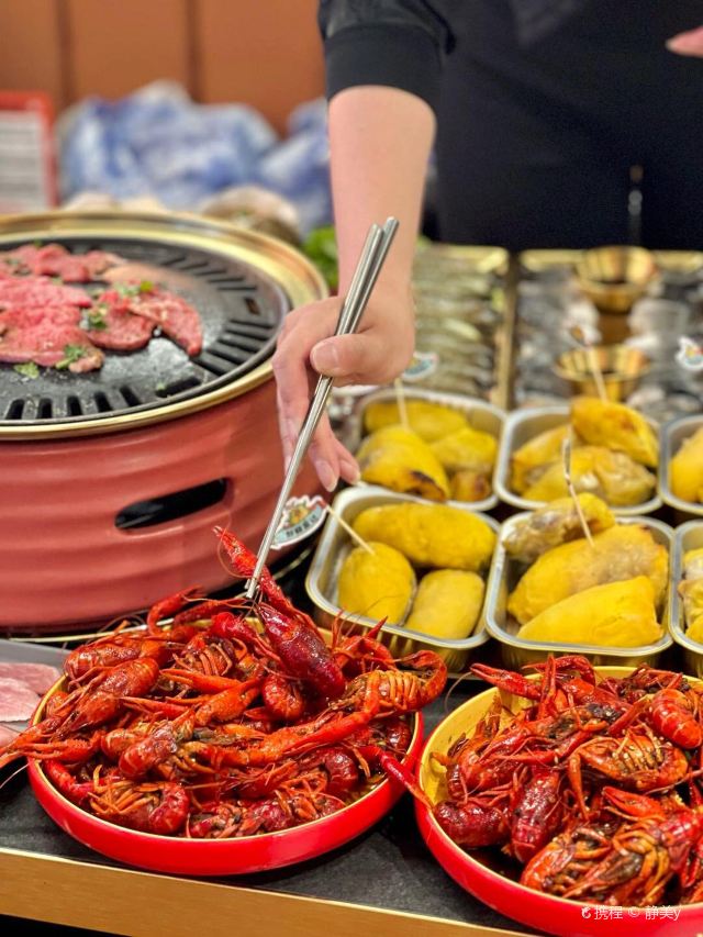 茉莉巡游记这几年泥炉烤肉蛮火的,听朋友说这家允辛家居然是自助式的,想吃多少吃多少的烤肉,肯定得安排上啦~ 🌟我们去的这家就在龙茗路商业街,人气蛮旺的,除了烤肉外,樱桃、荔枝、杨梅等水果也是畅吃的。小龙虾也有好几种口味,也太实惠了吧! ✔️法式羊排 这份羊排好诱人,放在烤盘上发出阵阵香味。吃着肥瘦相宜,肉香四溢,也没有膻味。 ✔️安格斯大片牛 他家的安格斯牛一盘一片,纹理清晰,烤个几十秒就可以吃了,肉质鲜美细嫩,我们点了好几盘。 ✔️鲜烤鳗鱼 在外面卖100+一盘的烤鳗鱼也是畅吃的 ,烤至焦黄时就可以吃了,入口肉质饱满,好好吃。 ✔️烤大生蚝 服务员把生蚝端上来的时候我震惊了,份量也太足了吧!生蚝个个大只,涂上蒜蓉酱,吃起来真爽。 ✔️深海鲍鱼 他家的鲍鱼份量很夯实,沾上后酱汁送入口中,吃起来嚼劲十足,蛮新鲜的。 ✔️阿根廷红虾 再来份阿根廷红虾,虾的个头蛮大的。虾头里虾膏肉眼可见地多,口感Q弹。 ✔️烤榴莲 再来试试烤榴莲,建议趁热吃。榴莲口感细腻,吃起来臭中带香,让人很上头。 #美食旬味会 #当地才能吃到的美食 #浪漫约会餐厅