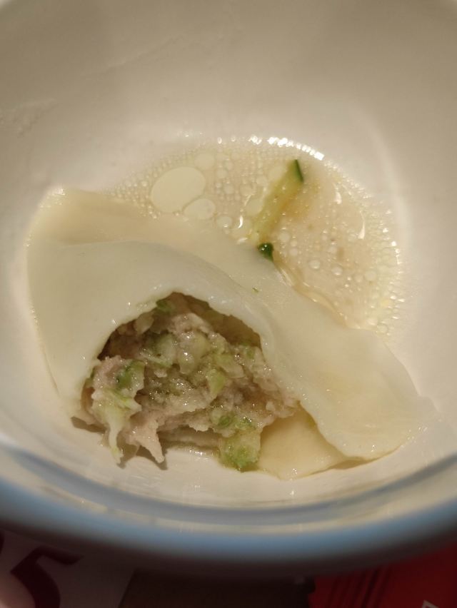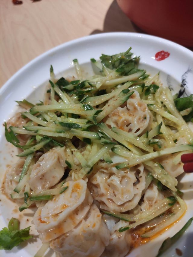 西芹水饺比较清口,但今天吃的西芹有点老,时不时来点渣渣。拌面藕很象考夫,上面加了青瓜丝,浇上花生浆,还不错,就是太冰了。