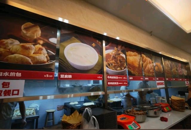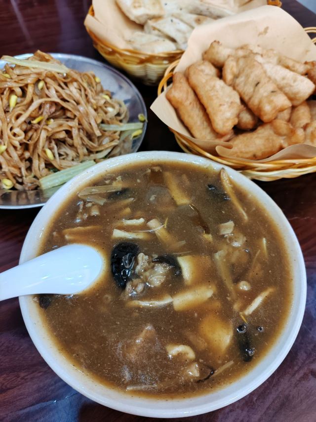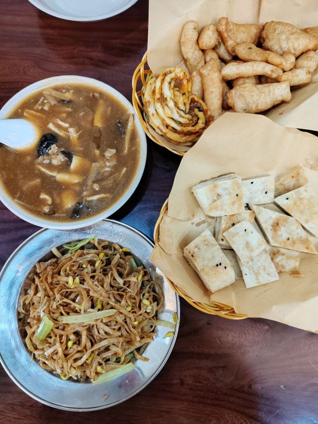 牛肉胡辣汤,羊肉水煎包,油饼,焖面,糖糕,豆腐脑