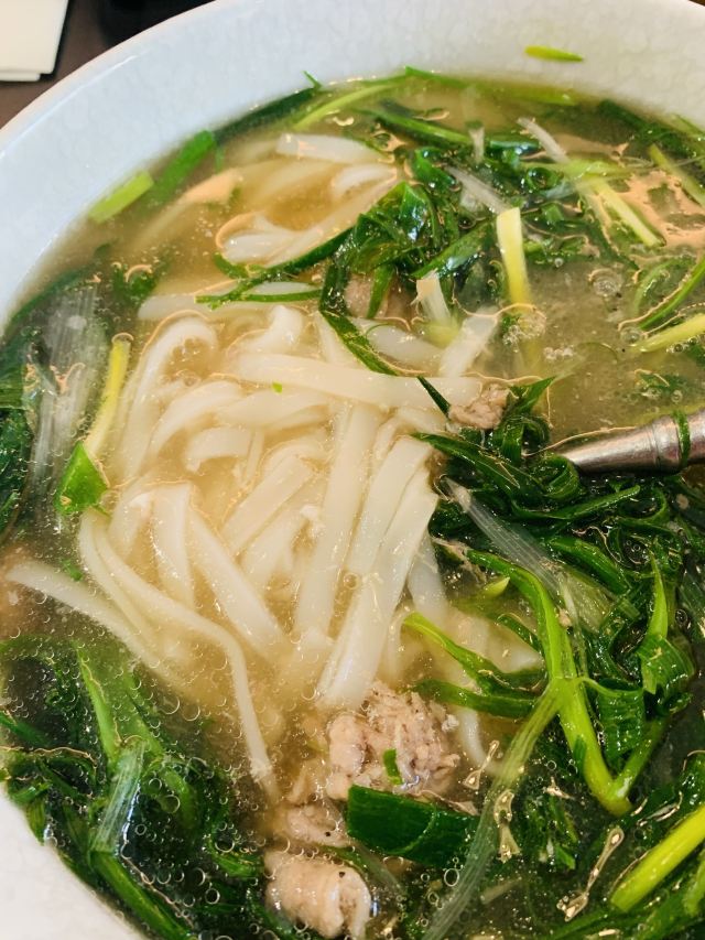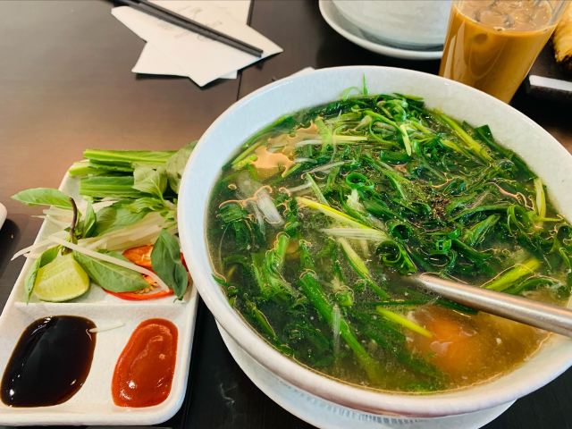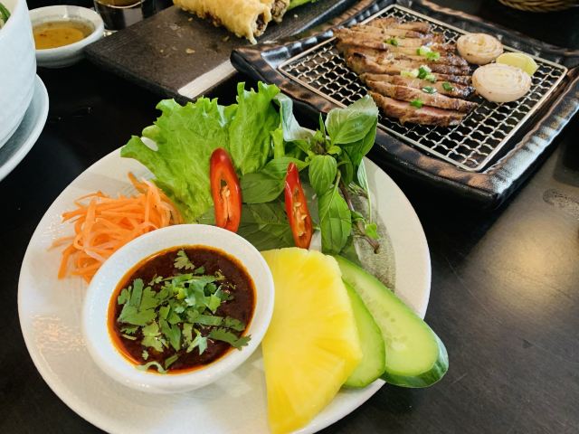 Trung Nguyên Legend咖啡品种特别多,我选得 越南鸡蛋咖啡 ,浓郁口感,朋友选得 越南滴漏1号粉咖啡 和 奥斯曼土耳其冰奶咖啡 ,都蛮好喝,都有炼乳,所以甜口向的。越南咖啡,炼乳大概也是点睛之笔了。 炙烤香茅猪颈肉 这道菜真的无功无过,口感一般。 越南春卷 其实更喜欢那种透明稻米浆做得米皮春卷,口感更清爽。 生牛肉粉 火车头这个不会出错的,大碗量足。 地段满分了,套餐性价比也不错。