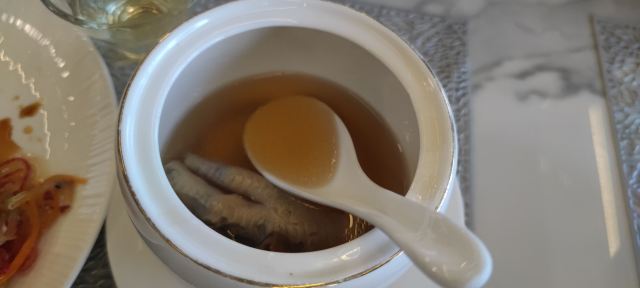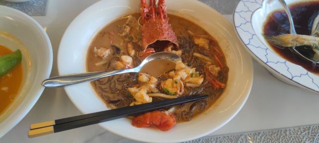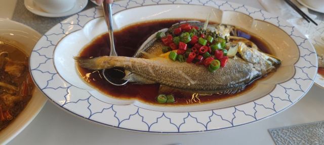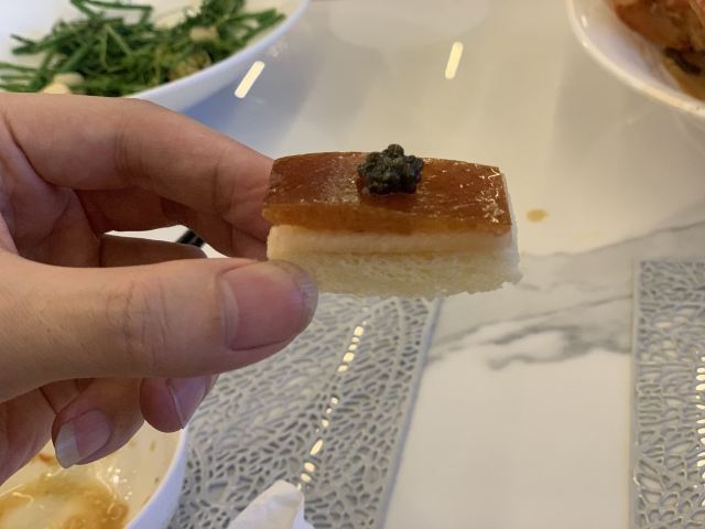 味道非常好,烤鸭做得相当细腻,那个用烤鸭皮,面包干,哈密瓜,鱼子做的一口酥特别好吃,有特色。其他菜,比如豆面龙虾有大闸蟹的味道,八宝饭非常软糯,清蒸大黄鱼带点辣等,也都非常有特色。值得再去