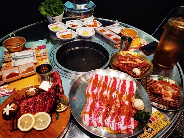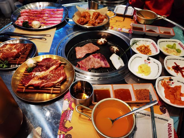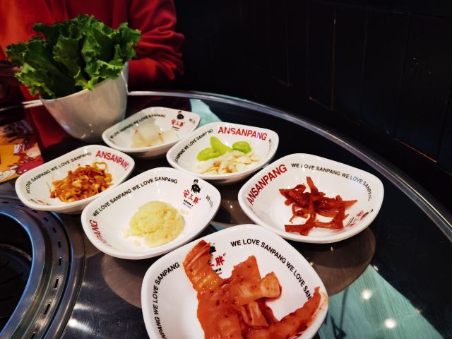 挺火的一家烤肉餐厅,特地去打卡,午餐时间还好,不用排队。 【口味】 菜品和韩国烤肉店比起来差不多,|南瓜粥^|蘸料^|小菜^都中规中矩,烤肉的肉质感好点,都挺厚实的。 【服务】 服务一般,虽然是工作人员帮烤的,但也不说下什么肉,也不说要等多久,就去别桌忙了……