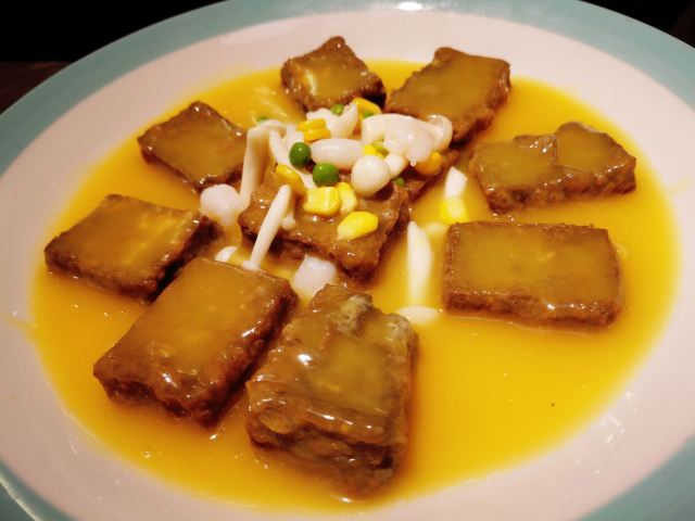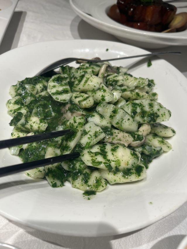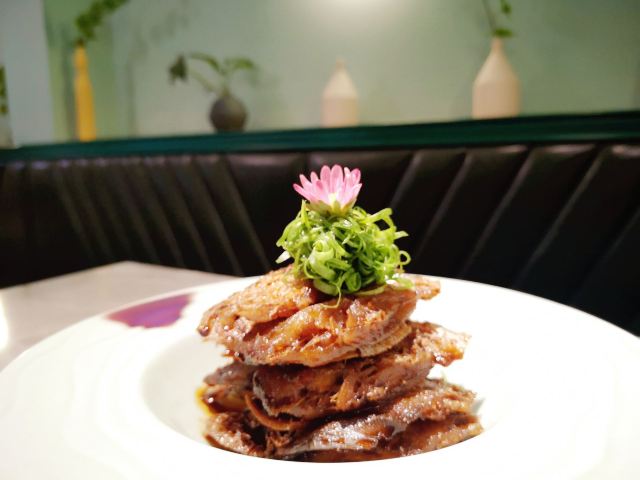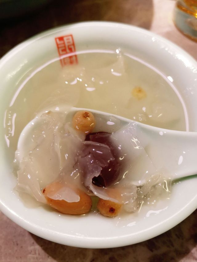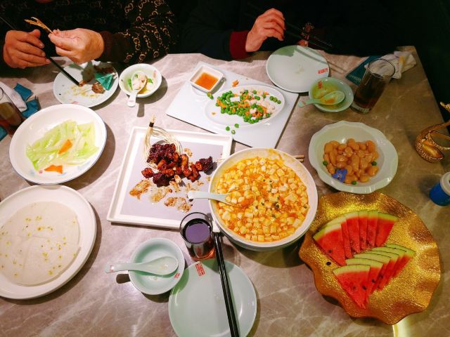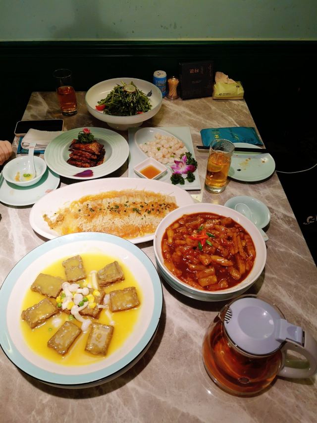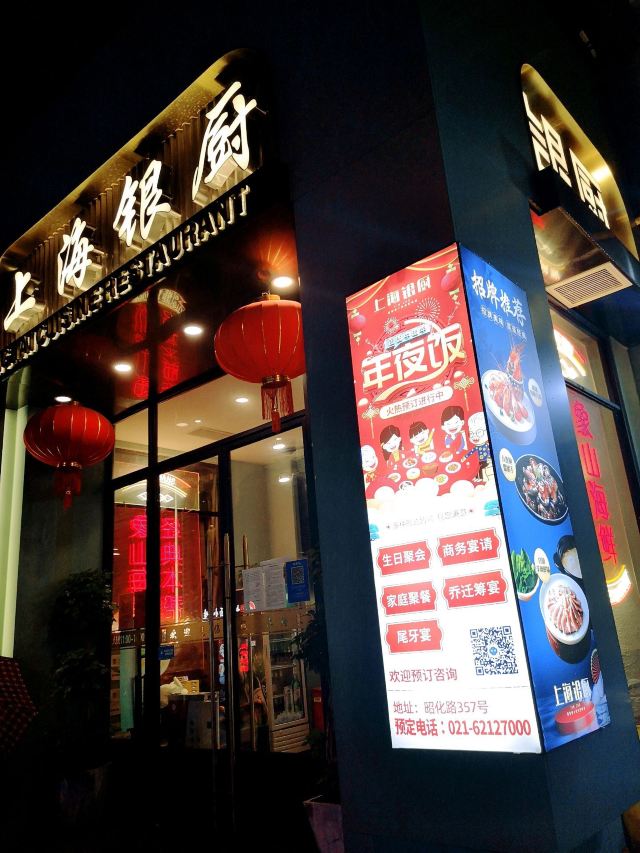 蓓家温暖是什么样的缘分让我能时隔一年后再次成为银厨的座上宾,冒着初冬连绵细雨打车前往,心中感概~缘,妙不可言! 环境:坐落在昭化路的上海银厨在雾气蒙蒙淅淅沥沥的雨夜,在漆黑冰冷的街道上散发出柔和温暖的灯光,犹如给归家心切的人点燃一盏指路明灯。整洁干净的大厅,薄荷绿和金色衬出清新雅致的格调,二层的空间足够容纳前来小酌聚餐的食客。 服务:提前打过预约电话,扫码进店后一位和蔼可亲的上海阿姐热情接待了我们,听着熟悉的上海话,感觉像回家吃饭一样放松。而每道菜上桌服务生都会报上菜名,并及时提醒有些菜烫口的要慢些享用,用餐后期店家还赠送免费红枣银耳羹给食客们品尝,上海阿姐则走到每一桌来听取食客对菜品的反馈及建议。如此细腻周到、认真规范的服务真的让我印象深刻。 |凉拌茼蒿菜^一道新鲜爽口的凉拌茼蒿让人食欲大开。 |本帮鲳鱼^炸的外脆里嫩,咸鲜带着甜味的本帮鲳鱼真的很对我的胃口,而且鲳鱼去头去尾用了最肥美最好吃的中段,足见店家对品控的标准不低。 |水晶虾仁^新鲜有弹性的河虾仁和碧绿的豌豆搭配让人赏心悦目,蘸上米醋提鲜,弹牙的口感。 |蒜蓉粉丝金针菇^蒜蓉炒出焦香,粉丝和金针菇蘸饱了汤汁,顺滑入味。 |虾仁手工黑豆腐^这一块块豆腐外皮炸的酥脆里面有着浓浓的豆香,蘸上汤汁更入味。 |浓汤煨山药蹄筋^这一大盘放了不少蹄筋,淡嫩不腻,质地犹如海参,而山药初食带脆,保温后逐渐软糯,这道菜味道嗲的。 |黄金麻饼^犹如花瓣展开的黄金麻饼大块厚实香香软软,里面豆沙馅甜的恰到好处。 |红枣银耳羹^虽然是赠送的但店家用料一点不马虎,大红枣,葡萄干香甜滑润,作为饭后甜品真的很不错。 |餐后水果^一盘餐后水果品种不少,西瓜、黄瓜和圣女果清爽消食。 这个双人套餐荤素搭配有层次感,每个菜各具特色又相得益彰,难得的是菜量很大,完全可以给三~四人食用,我打包回家给父母吃他们也说很好吃。时隔一年来店家用餐,感受到菜品和服务的提高以及满满的诚意,再见亦是缘分!